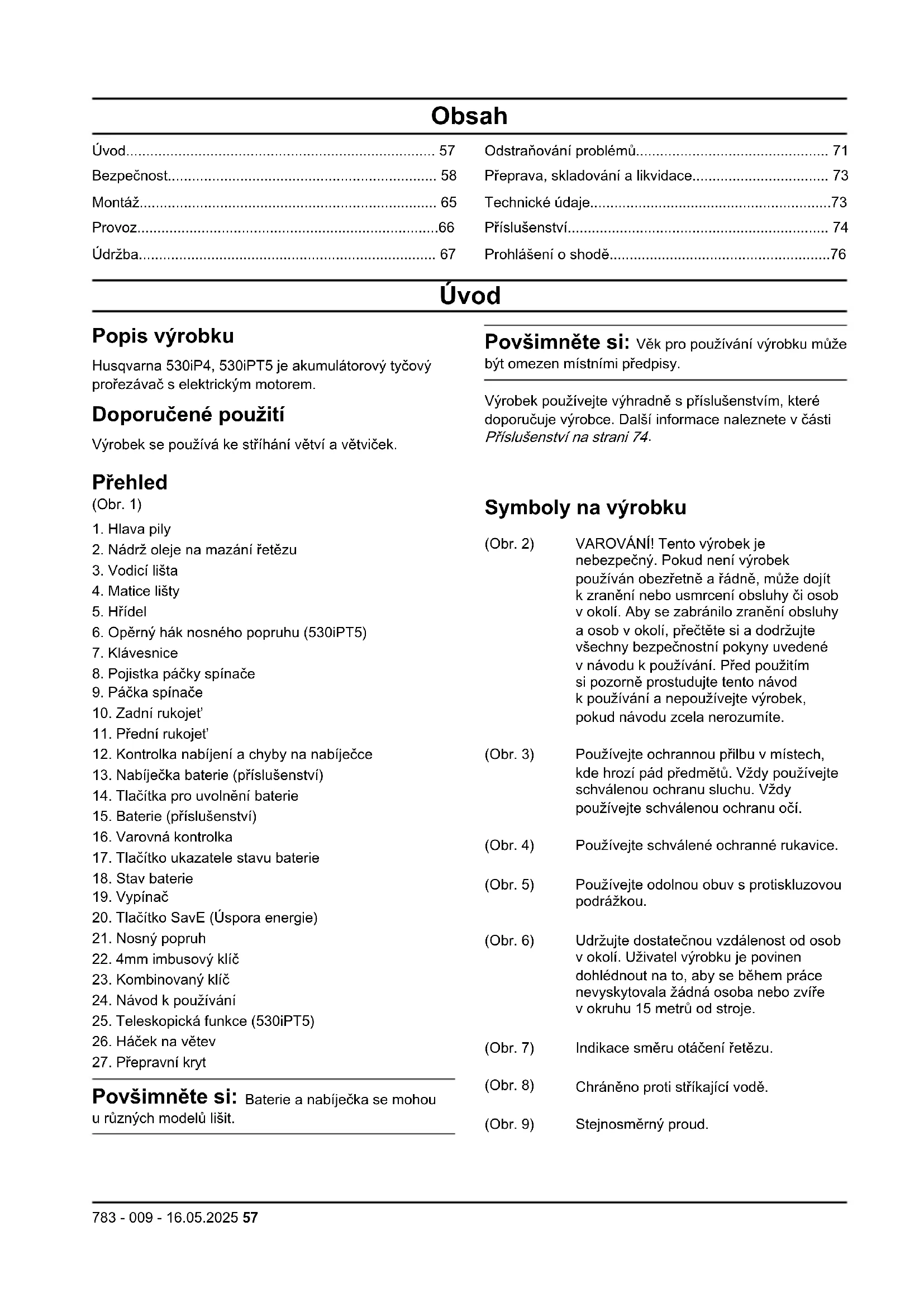 - Huskvarna, 2025-04-15 Стефан Холмберг, директор по развойна дейност, управление на технологиите, Husqvarna AB Отговорен за техническата документация 56 783 - 009 - 16.05.2025Obsah Úvod p. 57