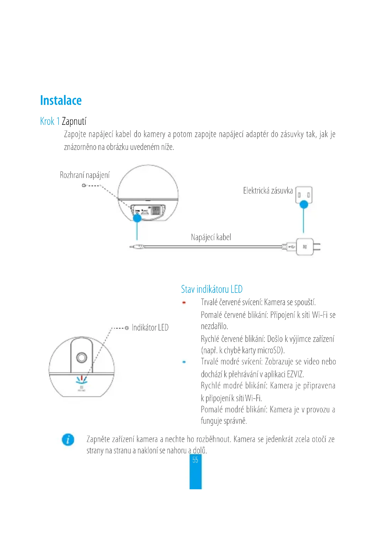 Περιεχόμενα συσκευασίας Κάμερα (x1) Βάση (x1) Καλώδιο τροφοδοσίας (x1) Πρότυπο διάτρησης (x1) Σετ βιδών (x1) Τροφοδοτικό (x1) Οδηγός γρήγορης εκκίνησης (x1)55 Instalace Krok1 Zapnutí Zapojte napájecí kabel do kamery apotom zapojte napájecí adaptér do zásuvky tak, jak je znázorněno na obrázku uvedeném níže. Elektrická zásuvka Rozhraní napájení Napájecí kabel Stav indikátoru LED Trvalé červené svícení: Kamera se spouští. Pomalé červené blikání: Připojení ksíti Wi-Fi se nezdařilo. Rychlé červené blikání: Došlo kvýjimce zařízení (např. kchybě karty microSD). Trvalé modré svícení: Zobrazuje se video nebo dochází kpřehrávání vaplikaci EZVIZ. Rychlé modré blikání: Kamera je připravena kpřipojení ksíti Wi-Fi. Pomalé modré blikání: Kamera je vprovozu a funguje správně. IndikátorLED Zapněte zařízení kamera anechte ho rozběhnout. Kamera se jedenkrát zcela otočí ze strany na stranu anakloní se nahoru adolů.56 Krok2 Nastavení kamery