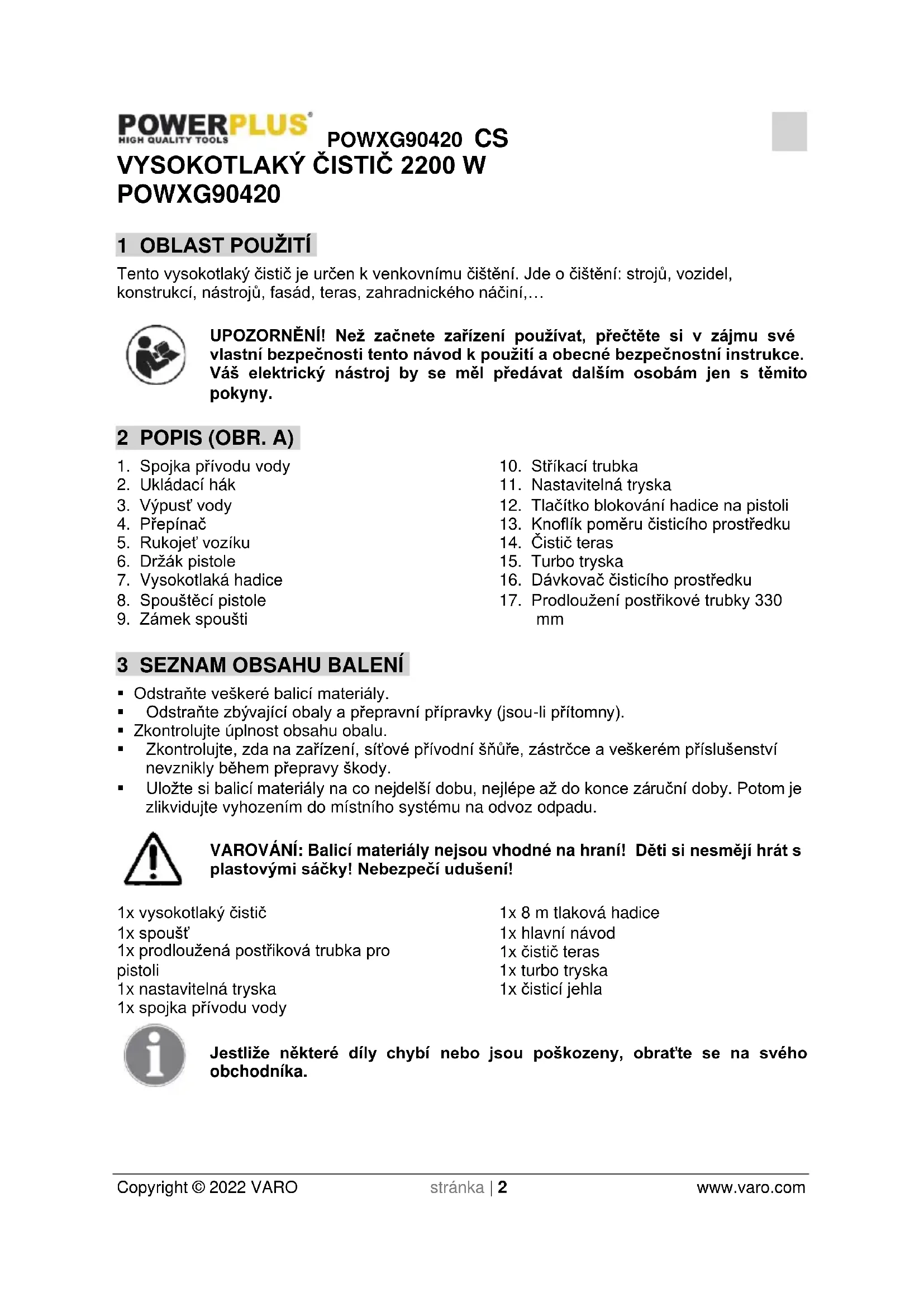 - Uložte si balicí materiály na co nejdelší dobu, nejlépe až do konce záruční doby. Potom je zlikvidujte vyhozením do místního systému na odvoz odpadu. VAROVÁNÍ: Balicí materiály nejsou vhodné na hraní! Děti si nesmějí hrát s plastovými sáčky! Nebezpečí udušení! 1x vysokotlaký čistič 1x spoušť 1x prodloužená postřiková trubka pro pistoli 1x nastavitelná tryska 1x spojka přívodu vody 1x 8 m tlaková hadice 1x hlavní návod 1x čistič teras 1x turbo tryska 1x čisticí jehla Jestliže některé díly chybí nebo jsou poškozeny, obraťte se na svého obchodníka.POWXG90420 CS Copyright © 2022 VARO stránka | 3 www.varo.com 4 DOPLŇKOVÉ BEZPEČNOSTNÍ PŘEDPISY PRO VYSOKOTLAKÉ ČISTIČE