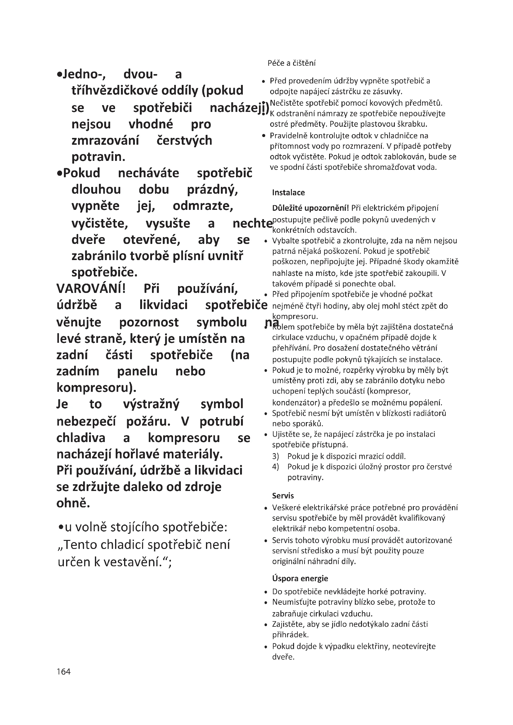 WĠēĞĂēŝƓƚĢŶş ͻƵǀŽůŶĢƐƚŽũşĐşŚŽƐƉŽƚƎĞďŝēĞ dĞŶƚŽĐŚůĂĚŝĐşƐƉŽƚƎĞďŝēŶĞŶş ƵƌēĞŶŬǀĞƐƚĂǀĢŶşnesmí být vyhozen spolu s komunálním odpadem a odpadky. Izolační pěna obsahuje hořlavé plyny; spotřebič musí být zlikvidován v souladu s předpisy týkajícími se spotřebičů, přičemž potřebné informace získáte od místních úřadů. Vyvarujte se poškození chladicí jednotky, zejména výměníku tepla. Materiály použité v tomto spotřebiči a označené symbolem A jsou recyklovatelné. Symbol na výrobku nebo na jeho obalu udává, že tento výrobek nepatří do domovního odpadu. Je nutné jej odvézt na příslušné sběrné místo pro recyklaci elektrického a elektronického zařízení. Zajištěním správné likvidace tohoto výrobku pomůžete zabránit případným negativním důsledkům na životní prostředí a lidské zdraví, k nimž by jinak došlo nevhodnou likvidací tohoto výrobku. Podrobnější informace o recyklaci tohoto výrobku získáte na místním obecním úřadu, středisku pro likvidaci domovního odpadu nebo v obchodě, kde jste tento výrobek zakoupili. KďĂůŽǀĠŵĂƚĞƌŝĄůLJ Materiály označené symbolem jsou recyklovatelné. Obaly vyhoďte do příslušných sběrných kontejnerů, aby mohly být zrecyklovány.