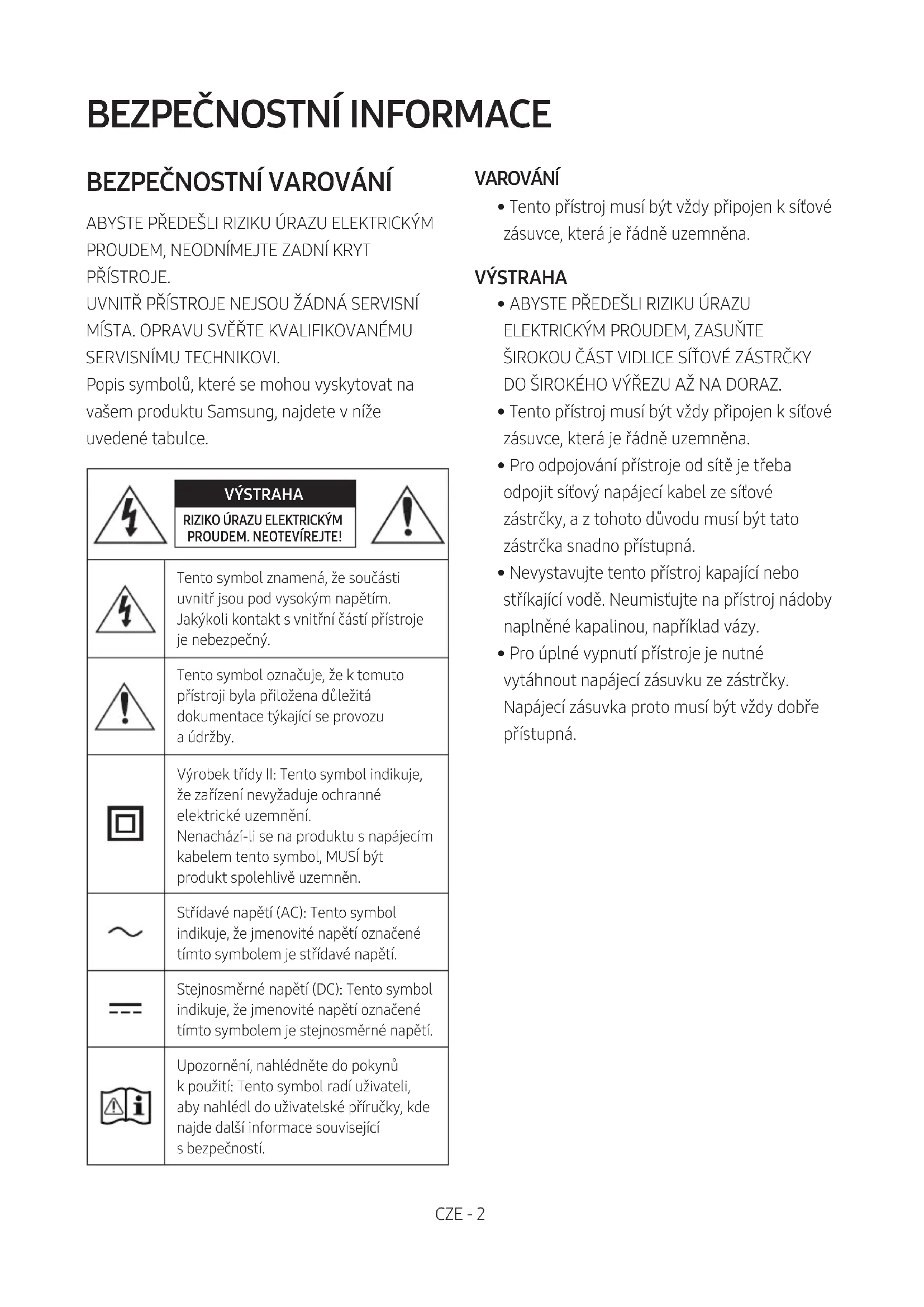 MÍSTA. OPRAVU SVĚŘTE KVALIFIKOVANÉMU SERVISNÍMU TECHNIKOVI. Popis symbolů, které se mohou vyskytovat na vašem produktu Samsung, najdete v níže uvedené tabulce. VÝSTRAHA RIZIKO ÚRAZU ELEKTRICKÝM PROUDEM. NEOTEVÍREJTE!Tento symbol znamená, že součásti uvnitř jsou pod vysokým napětím. Jakýkoli kontakt svnitřní částí přístroje je nebezpečný.Tento symbol označuje, že ktomuto přístroji byla přiložena důležitá dokumentace týkající se provozu aúdržby.Výrobek třídyII: Tento symbol indikuje, že zařízení nevyžaduje ochranné elektrické uzemnění. Nenachází-li se na produktu s napájecím kabelem tento symbol, MUSÍ být produkt spolehlivě uzemněn. Střídavé napětí (AC): Tento symbol indikuje, že jmenovité napětí označené tímto symbolem je střídavé napětí.Stejnosměrné napětí (DC): Tento symbol indikuje, že jmenovité napětí označené tímto symbolem je stejnosměrné napětí.Upozornění, nahlédněte do pokynů kpoužití: Tento symbol radí uživateli, aby nahlédl do uživatelské příručky, kde najde další informace související sbezpečností. VAROVÁNÍ