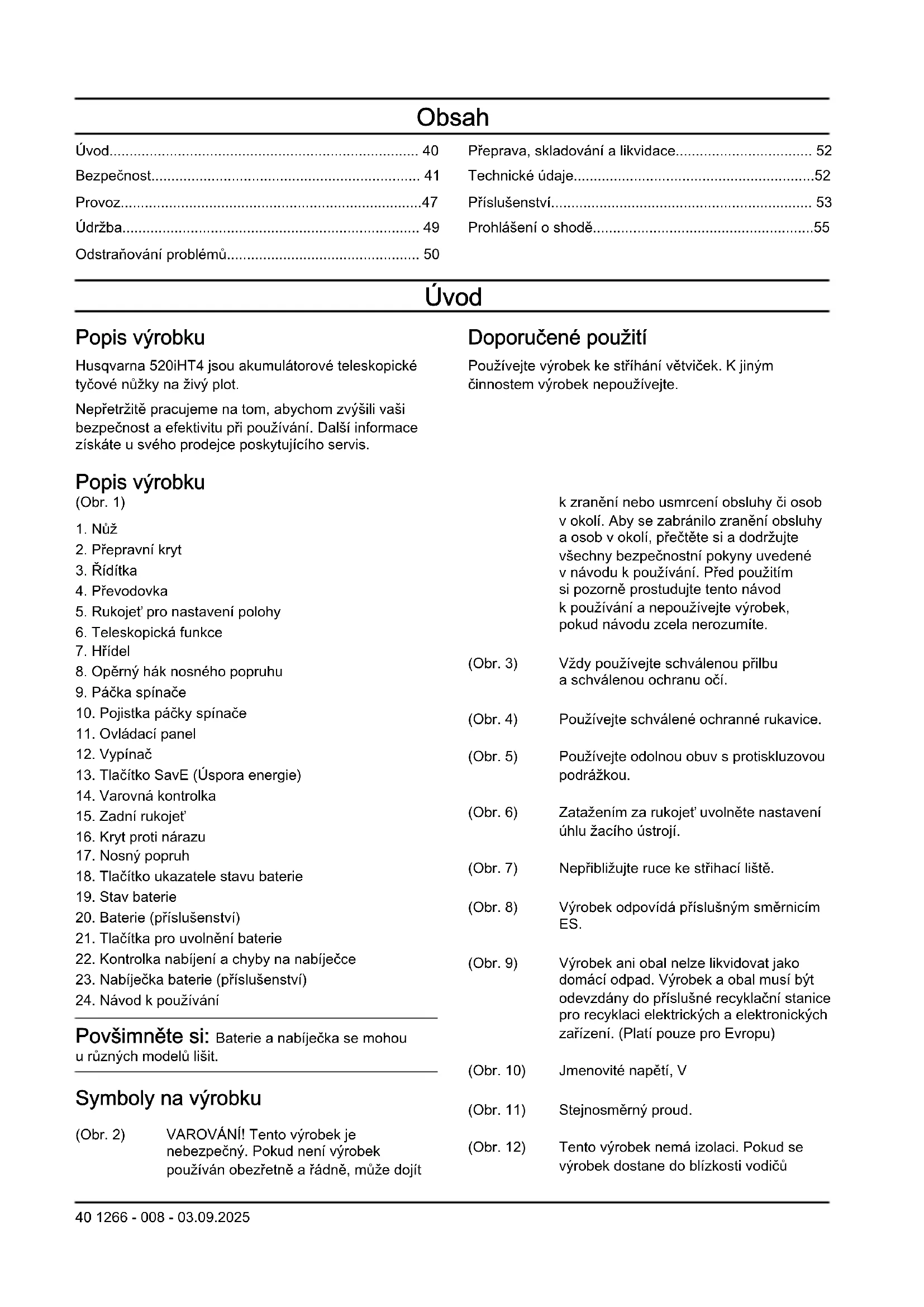 - Huskvarna 2023-12-01 Стефан Холмберг, директор по развойна дейност, управление на технологиите, Husqvarna AB Отговорен за техническата документация 1266 - 008 - 03.09.2025 39Obsah Úvod p. 40