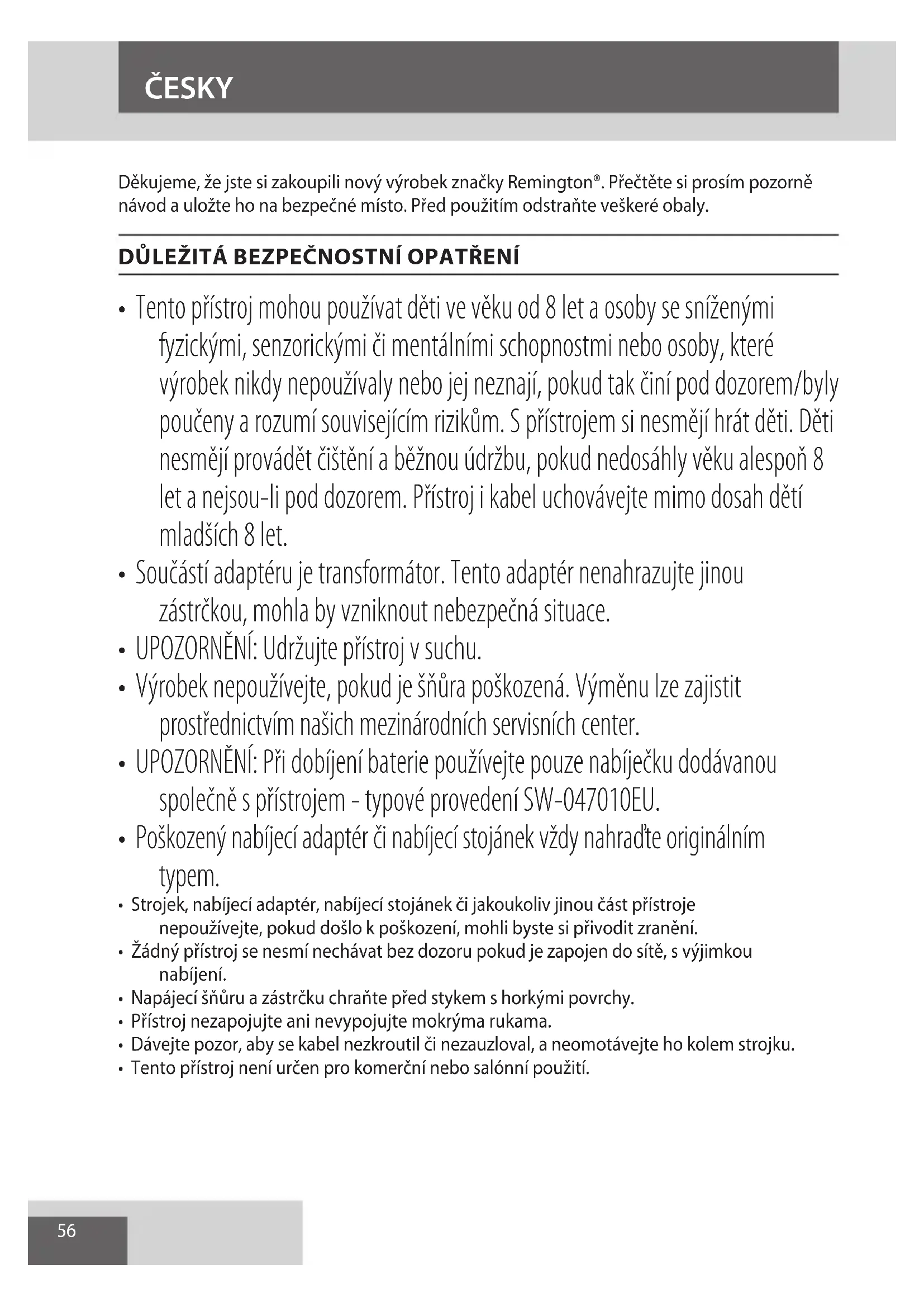 AE56 Děkujeme, že jste si zakoupili nový výrobek značky Remington®. Přečtěte si prosím pozorně návod a uložte ho na bezpečné místo. Před použitím odstraňte veškeré obaly. DŮLEŽITÁ BEZPEČNOSTNÍ OPATŘENÍ