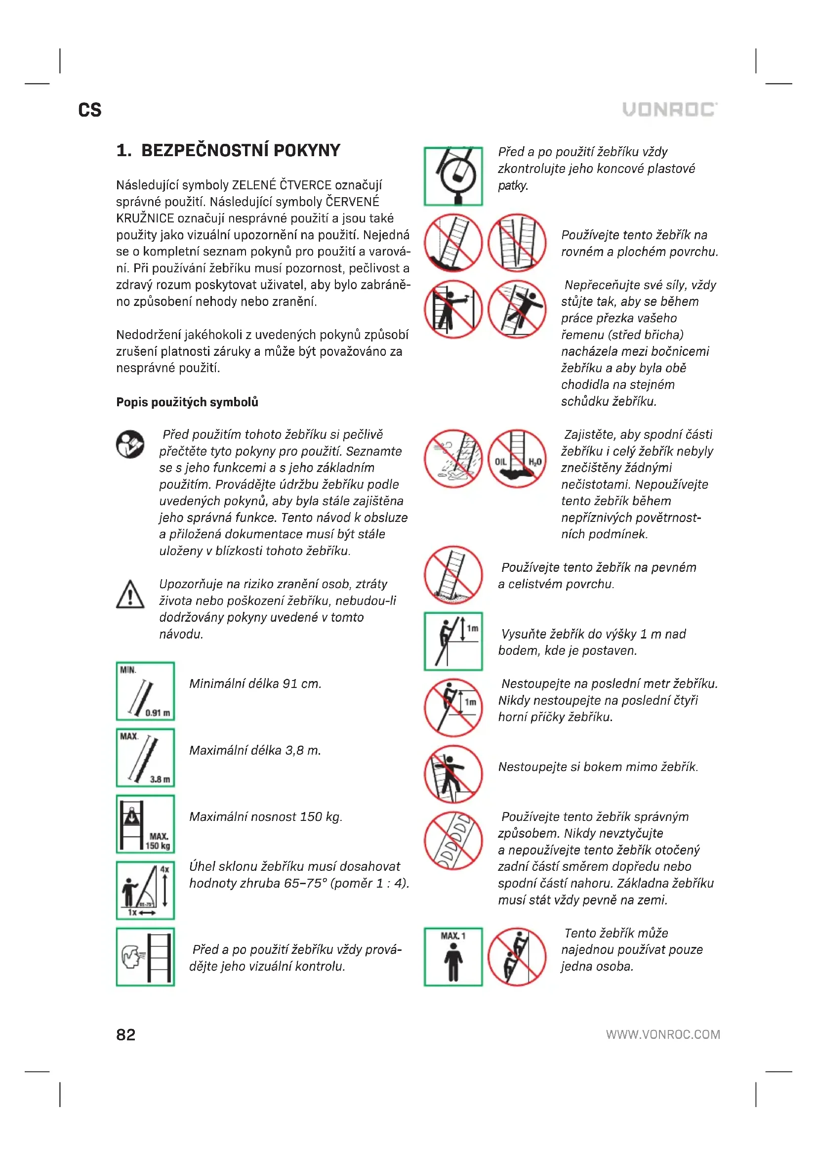 Minimální délka 91 cm. Maximální délka 3,8 m. Maximální nosnost 150 kg. Úhel sklonu žebříku musí dosahovat hodnoty zhruba 65–75° (poměr 1 : 4). Před a po použití žebříku vždy prová- dějte jeho vizuální kontrolu. Před a po použití žebříku vždy zkontrolujte jeho koncové plastové patky. Používejte tento žebřík na rovném a plochém povrchu. Nepřeceňujte své síly, vždy stůjte tak, aby se během práce přezka vašeho řemenu (střed břicha) nacházela mezi bočnicemi žebříku a aby byla obě chodidla na stejném schůdku žebříku. Zajistěte, aby spodní části žebříku i celý žebřík nebyly znečištěny žádnými nečistotami. Nepoužívejte tento žebřík během nepříznivých povětrnost- ních podmínek. Používejte tento žebřík na pevném acelistvém povrchu. Vysuňte žebřík do výšky 1 m nad bodem, kde je postaven. Nestoupejte na poslední metr žebříku. Nikdy nestoupejte na poslední čtyři horní příčky žebříku. Nestoupejte si bokem mimo žebřík. Používejte tento žebřík správným způsobem. Nikdy nevztyčujte anepoužívejte tento žebřík otočený zadní částí směrem dopředu nebo spodní částí nahoru. Základna žebříku musí stát vždy pevně na zemi. Tento žebřík může najednou používat pouze jedna osoba.CS
