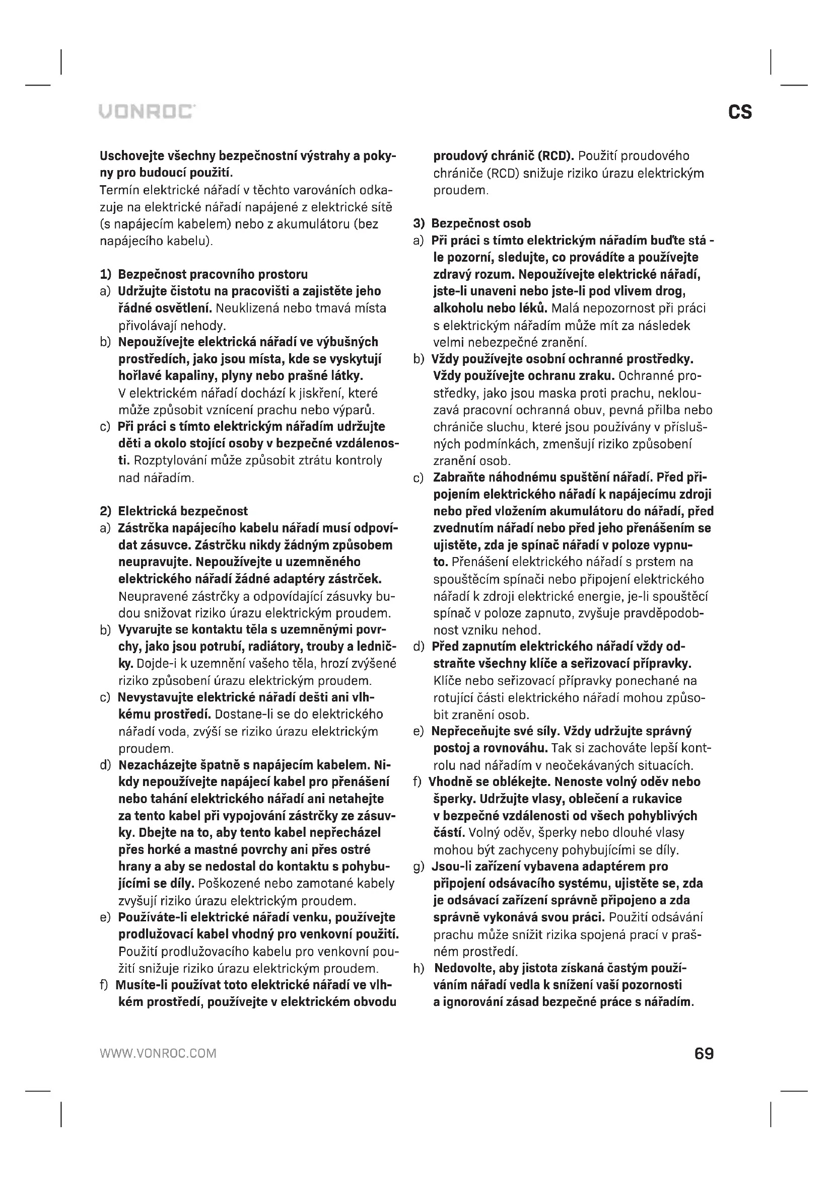 Poškozená alikvidovaná elektrická nebo elektronická zařízení musí být odevzdána ve sběrných dvorech, které jsou určeny pro tento účel. Pouze pro země EU Nevyhazujte elektrická nářadí do běžného domácího odpadu. Podle evropské směrnice 2012/19/EC týka- jící se likvidace elektrických aelektronických zařízení ajejí implementace do vnitrostátního práva, musí být nepoužívaná elektrická nářadí shromažďována odděleně ajejich likvidace musí být provedena tak, aby nedošlo kohrožení životního prostředí. ZÁRUKA Výrobky VONROC jsou vyvíjeny vsouladu spožadavky norem na nejvyšší kvalitu aje zaručeno, že po dobu platné záruky, která začíná běžet dnem původního nákupu, nebudou na těchto výrobcích žádné vady materiálu, ani vady způsobené špatným dílenským zpracováním. Dojde-li během tohoto období kzávadě vdůsledku vady materiálu nebo dílenského zpracování, kontaktujte přímo firmu VONROC. Ztéto záruky jsou vyloučeny následující případy: