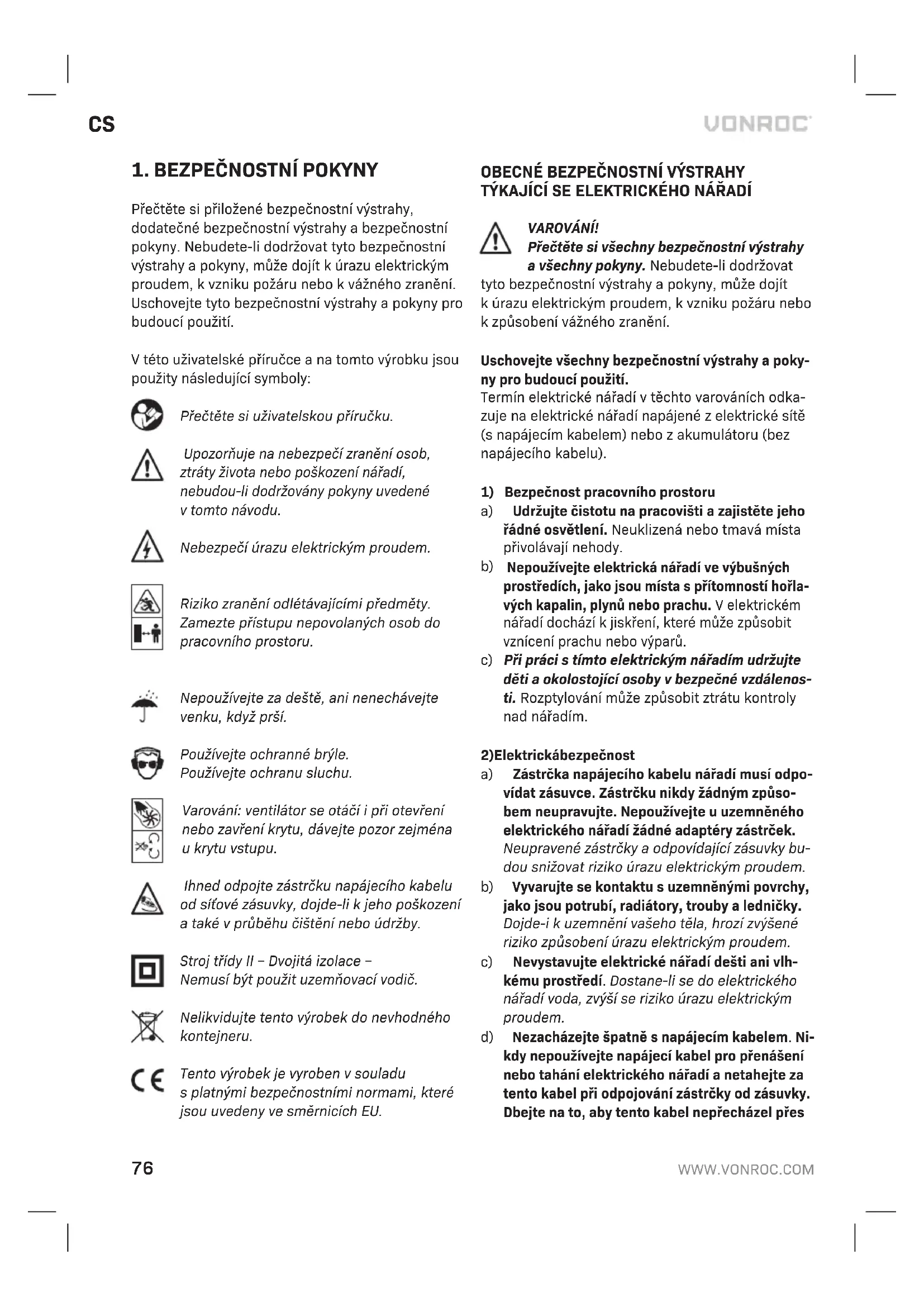 Poškozená alikvidovaná elektrická nebo elektronická zařízení musí být odevzdána ve sběrných dvorech, které jsou určeny pro tento účel. Pouze pro země EU Nevyhazujte elektrická nářadí do běžného domácího odpadu. Podle evropské směrnice 2012/19/EC týkající se likvidace elektrických aelektronických zařízení ajejí implementace do vnitrostátního práva, musí být nepoužívaná elektrická nářadí shromažďo- vána odděleně ajejich likvidace musí být provedena tak, aby nedošlo kohrožení životního prostředí. ZÁRUKA Výrobky VONROC jsou vyvíjeny vsouladu spoža- davky norem na nejvyšší kvalitu aje zaručeno, že po dobu platné záruky, která začíná běžet dnem původního nákupu, nebudou na těchto výrobcích žádné vady materiálu, ani vady způsobené špatným dílenským zpracováním. Dojde-li během tohoto období kzávadě vdůsledku vady materiálu nebo dílenského zpracování, kontaktujte přímo firmu VONROC. Ztéto záruky jsou vyloučeny následující případy:
