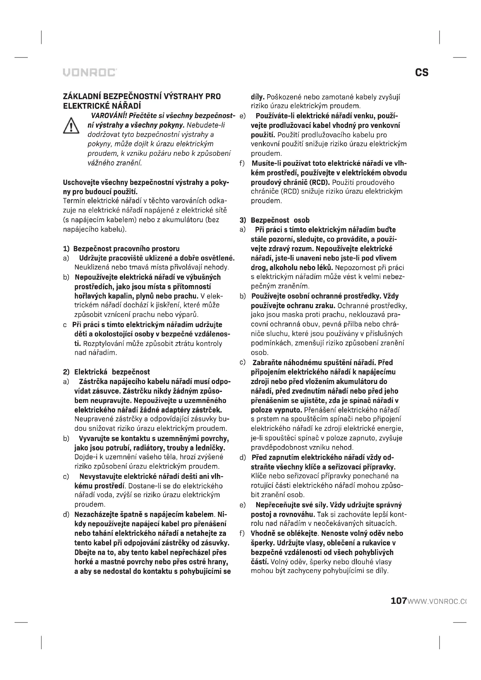 Poškozená a likvidovaná elektrická nebo elektronická zařízení musí být odevzdána ve sběrných dvorech, které jsou určeny pro tento účel. Pouze pro země EU Nevyhazujte elektrická nářadí do běžného domácí- ho odpadu. Podle evropské směrnice 2012/19/EU týkající se likvidace elektrických a elektronických zařízení a její implementace do vnitrostátního práva, musí být nepoužívaná elektrická nářadí shromažďována odděleně a jejich likvidace musí být provedena tak, aby nedošlo k ohrožení životního prostředí. ZÁRUKA Výrobky VONROC jsou vyvíjeny v souladu s poža- davky norem na nejvyšší kvalitu a je zaručeno, že po dobu platné záruky, která začíná běžet dnem původního nákupu, nebudou na těchto výrobcích žádné vady materiálu, ani vady způsobené špatným dílenským zpracováním. Dojde-li během tohoto období k závadě v důsledku vady materiálu nebo dílenského zpracování, kontaktujte přímo fi rmu VONROC. Z této záruky jsou vyloučeny následující případy:
