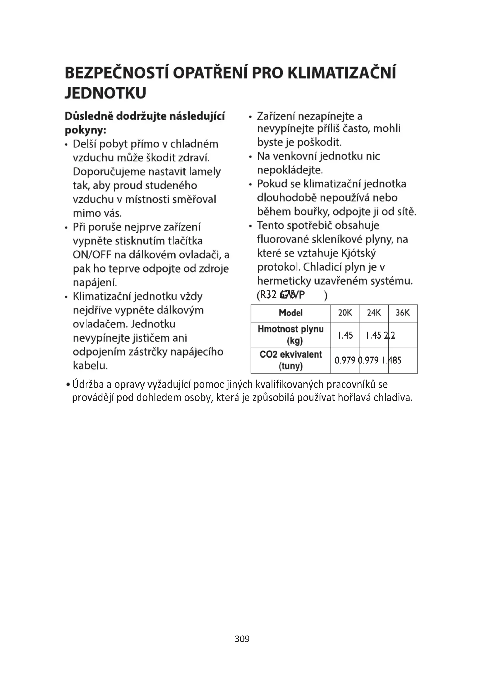 Údržba a opravy vyžadující pomoc jiných kvalifikovaných pracovníků se provádějí pod dohledem osoby, která je způsobilá používat hořlavá chladiva.310