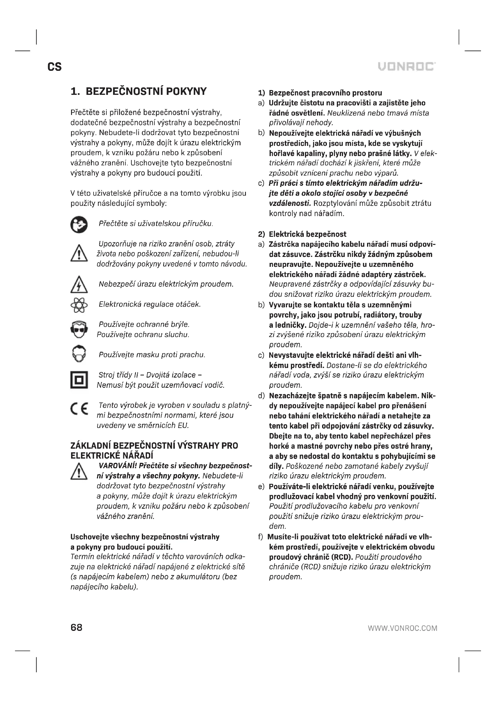 Poškozená alikvidovaná elektrická nebo elektronická zařízení musí být odevzdána ve sběrných dvorech, které jsou určeny pro tento účel. Pouze pro země EU Nevyhazujte elektrická nářadí do běžného domácího odpadu. Podle evropské směrnice 2012/19/EC týka- jící se likvidace elektrických aelektronických zařízení ajejí implementace do vnitrostátního práva, musí být nepoužívaná elektrická nářadí shromažďována odděleně ajejich likvidace musí být provedena tak, aby nedošlo kohrožení životního prostředí. ZÁRUKA Výrobky VONROC jsou vyveny vsouladu spoža- davky norem na nejvyšší kvalitu aje zaručeno, že po dobu platné záruky, která začíná běžet dnem původního nákupu, nebudou na těchto výrobcích žádné vady materiálu, ani vady způsobené špatným dílenským zpracováním. Dojde-li během tohoto období kzávadě vdůsledku vady materiálu nebo dílenského zpracování, kontaktujte přímo firmu VONROC. Ztéto záruky jsou vyloučeny následující případy: