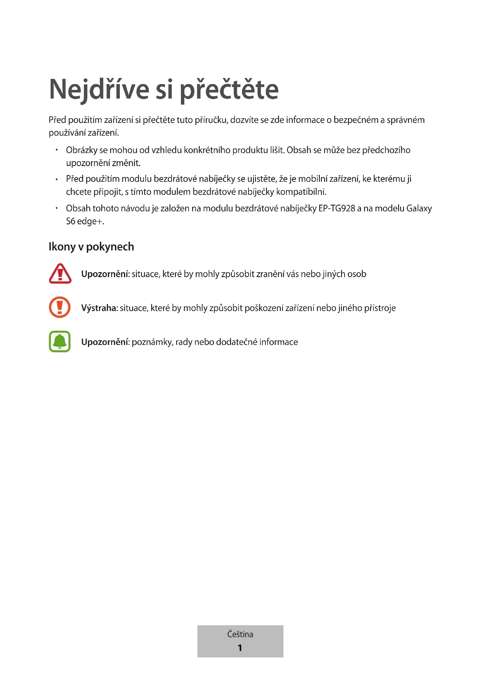 Obsah tohoto návodu je založen na modulu bezdrátové nabíječky EP-TG928 a na modelu Galaxy S6 edge+. Ikony v pokynech Upozornění: situace, které by mohly způsobit zranění vás nebo jiných osob Výstraha: situace, které by mohly způsobit poškození zařízení nebo jiného přístroje Upozornění: poznámky, rady nebo dodatečné informace Čeština
