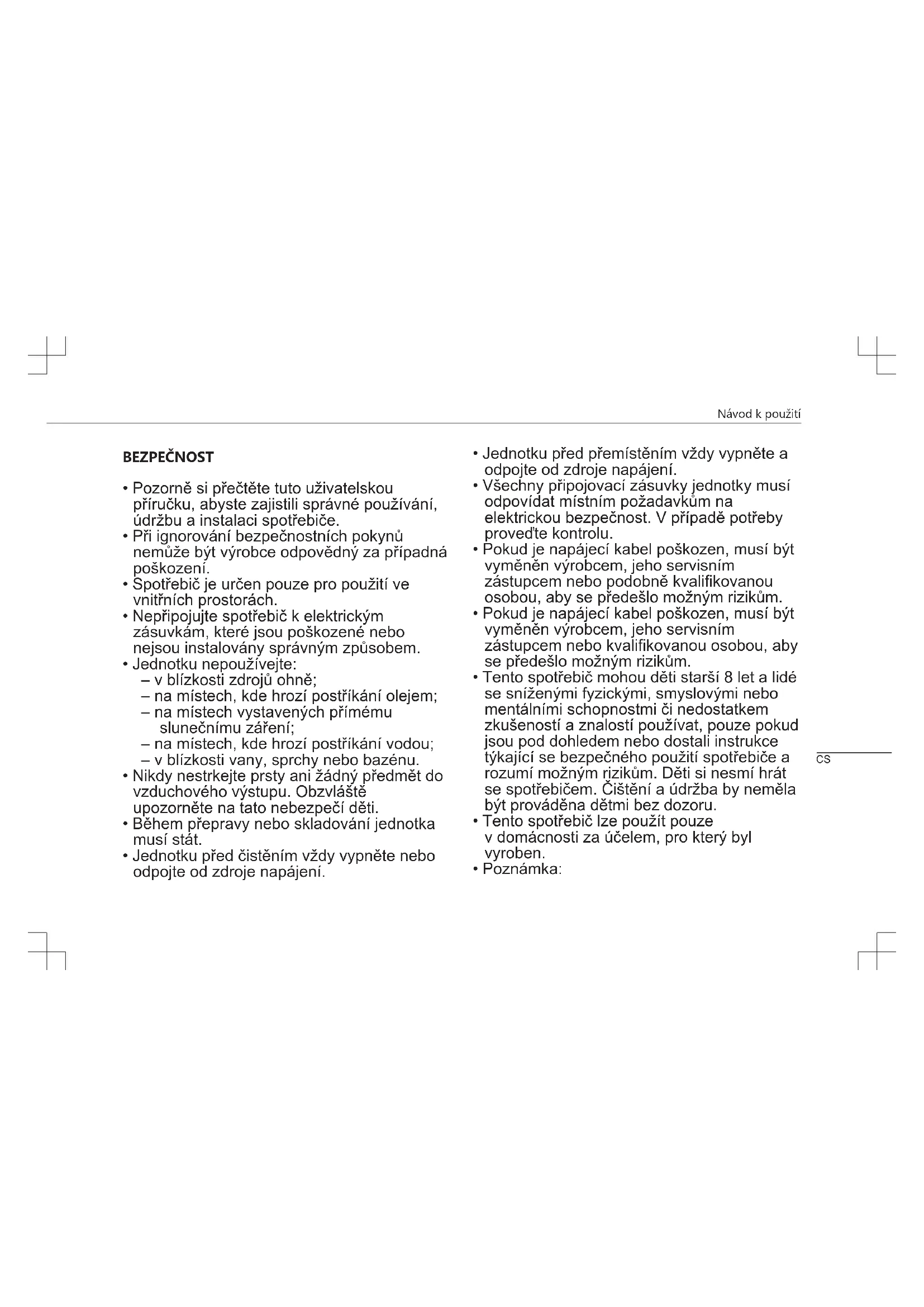 - Tento spotřebič mohou děti starší 8 let a lidé se sníženými fyzickými, smyslovými nebo mentálními schopnostmi či nedostatkem zkušeností a znalostí používat, pouze pokud jsou pod dohledem nebo dostali instrukce týkající se bezpečného použití spotřebiče a rozumí možným rizikům. Děti si nesmí hrát se spotřebičem. Čištění a údržba by neměla být prováděna dětmi bez dozoru.