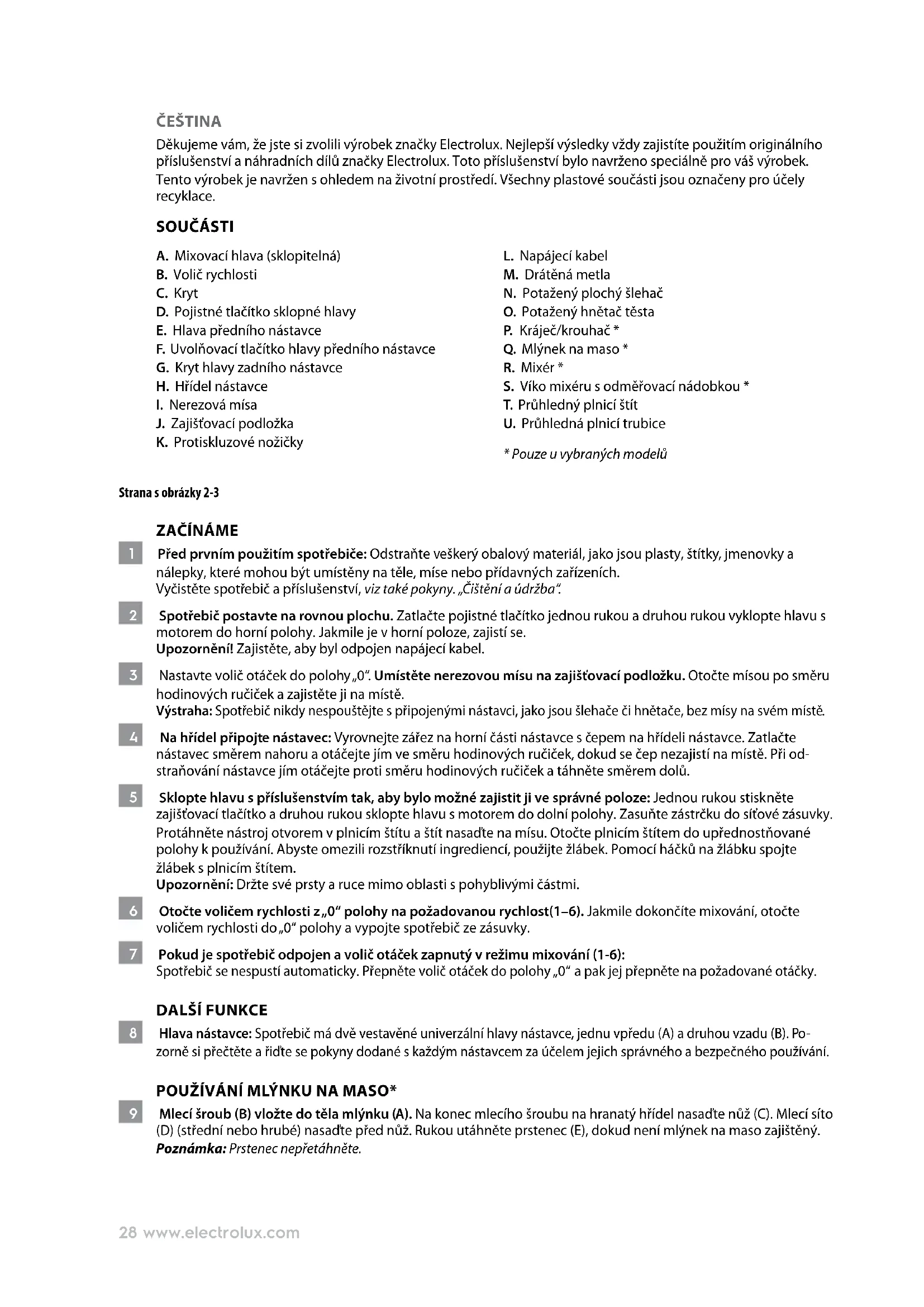17 Vypojte spotřebič ze zásuvky. Šlehač, mlýnek* a kráječ/struhadlo* je třeba mýt výhradně ručně v teplé vodě s mycím prostředkem. Mísu, hnětač a hák na těsto je možné mýt v myčce. Součásti umísťujte pouze do horního koše myčky. Upozornění! Nože a vložky jsou velmi ostré a mohou způsobit zranění. Varování! Nikdy tělo spotřebiče, zástrčku nebo kabel nenořte do vody či jakékoliv jiné kapaliny. Před použitím každou součást důkladně vysušte. 18 Čištění mixéru*: Otočte mixér proti směru hodinových ručiček a sejměte jej. Sejměte víko. Vylijte směs z mixéru. Přidejte kapku mycího prostředku a jeden litr teplé vody. Nasaďte mixér na spotřebič. Spusťte stroj na otáčky 6 na dobu půl minuty, pak vodu vylijte. Opláchněte mixér a nechte jej oschnout. Upozornění! Nože a vložky jsou velmi ostré a mohou způsobit zranění. 19 Tělo by mělo být vyčištěno měkkým vlhkým hadrem a pak vysušeno jiným hadrem. Poznámka: K čištění spotřebiče nepoužívejte prostředky s drsnými částicemi nebo drátěnky. Užijte si váš nový výrobek Electrolux!30 www.electrolux.com
