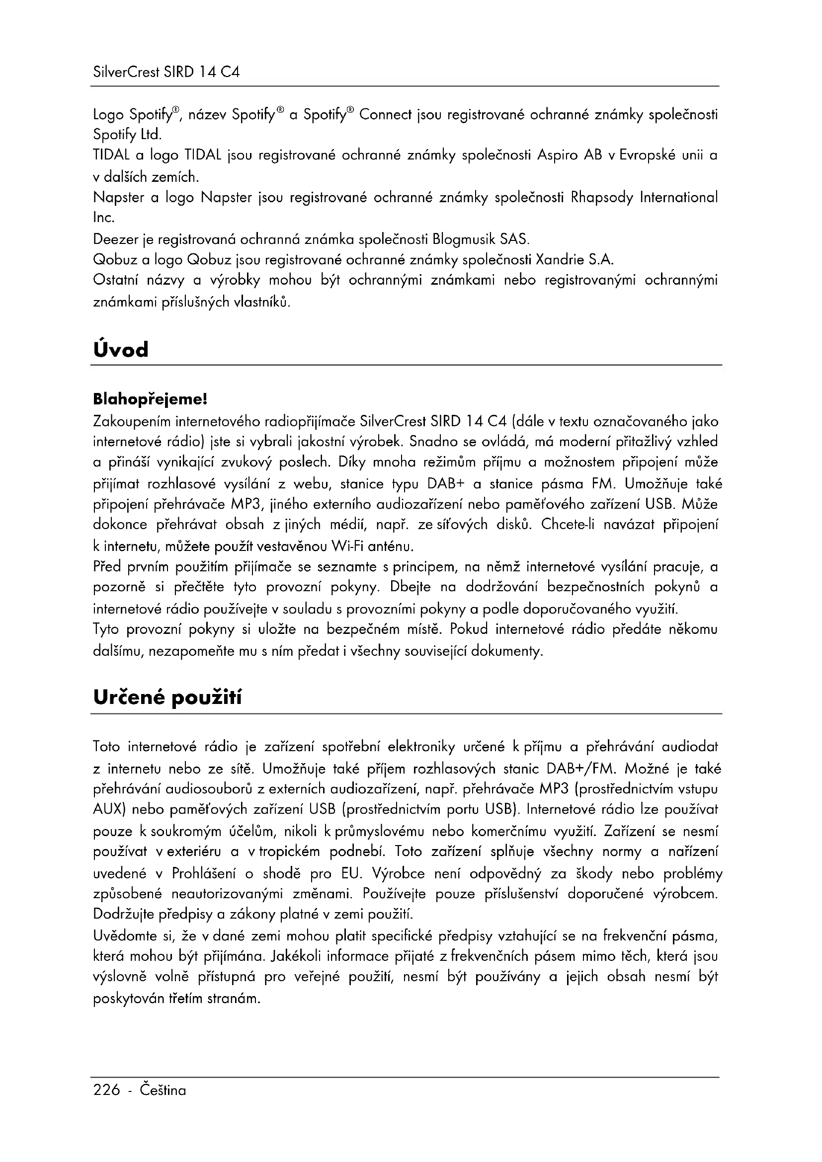 Connect jsou registrované ochranné známky společnosti Spotify Ltd. TIDAL a logo TIDAL jsou registrované ochranné známky společnosti Aspiro AB v Evropské unii a v dalších zemích. Napster a logo Napster jsou registrované ochranné známky společnosti Rhapsody International Inc. Deezer je registrovaná ochranná známka společnosti Blogmusik SAS. Qobuz a logo Qobuz jsou registrované ochranné známky společnosti Xandrie S.A. Ostatní názvy a výrobky mohou být ochrannými známkami nebo registrovanými ochrannými známkami příslušných vlastníků. Úvod Blahopřejeme! Zakoupením internetového radiopřijímače SilverCrest SIRD 14 C4 (dále v textu označovaného jako internetové rádio) jste si vybrali jakostní výrobek. Snadno se ovládá, má moderní přitažlivý vzhled a přináší vynikající zvukový poslech. Díky mnoha režimům příjmu a možnostem připojení může přijímat rozhlasové vysílání z webu, stanice typu DAB+ a stanice pásma FM. Umožňuje také připojení přehrávače MP3, jiného externího audiozařízení nebo paměťového zařízení USB. Může dokonce přehrávat obsah z jiných médií, např. ze síťových disků. Chcete-li navázat připojení k internetu, můžete použít vestavěnou Wi-Fi anténu. Před prvním použitím přijímače se seznamte s principem, na němž internetové vysílání pracuje, a pozorně si přečtěte tyto provozní pokyny. Dbejte na dodržování bezpečnostních pokynů a internetové rádio používejte v souladu s provozními pokyny a podle doporučovaného využití. Tyto provozní pokyny si uložte na bezpečném místě. Pokud internetové rádio předáte někomu dalšímu, nezapomeňte mu s ním předat i všechny související dokumenty. Určené použití Toto internetové rádio je zařízení spotřební elektroniky určené k příjmu a přehrávání audiodat z internetu nebo ze sítě. Umožňuje také příjem rozhlasových stanic DAB+/FM. Možné je také přehrávání audiosouborů z externích audiozařízení, např. přehrávače MP3 (prostřednictvím vstupu AUX) nebo paměťových zařízení USB (prostřednictvím portu USB). Internetové rádio lze používat pouze k soukromým účelům, nikoli k průmyslovému nebo komerčnímu využití. Zařízení se nesmí používat v exteriéru a v tropickém podnebí. Toto zařízení splňuje všechny normy a nařízení uvedené v Prohlášení o shodě pro EU. Výrobce není odpovědný za škody nebo problémy způsobené neautorizovanými změnami. Používejte pouze příslušenství doporučené výrobcem. Dodržujte předpisy a zákony platné v zemi použití. Uvědomte si, že v dané zemi mohou platit specifické předpisy vztahující se na frekvenční pásma, která mohou být přijímána. Jakékoli informace přijaté z frekvenčních pásem mimo těch, která jsou výslovně volně přístupná pro veřejné použití, nesmí být používány a jejich obsah nesmí být poskytován třetím stranám.SilverCrest SIRD 14 C4 Čeština - 227 Obsah balení Přístroj a veškeré příslušenství vyndejte z obalu. Odstraňte obalový materiál a zkontrolujte, zda jsou všechny součástí kompletní a nepoškozené. Pokud zjistíte jakoukoli chybějící nebo poškozenou položku, kontaktujte výrobce.