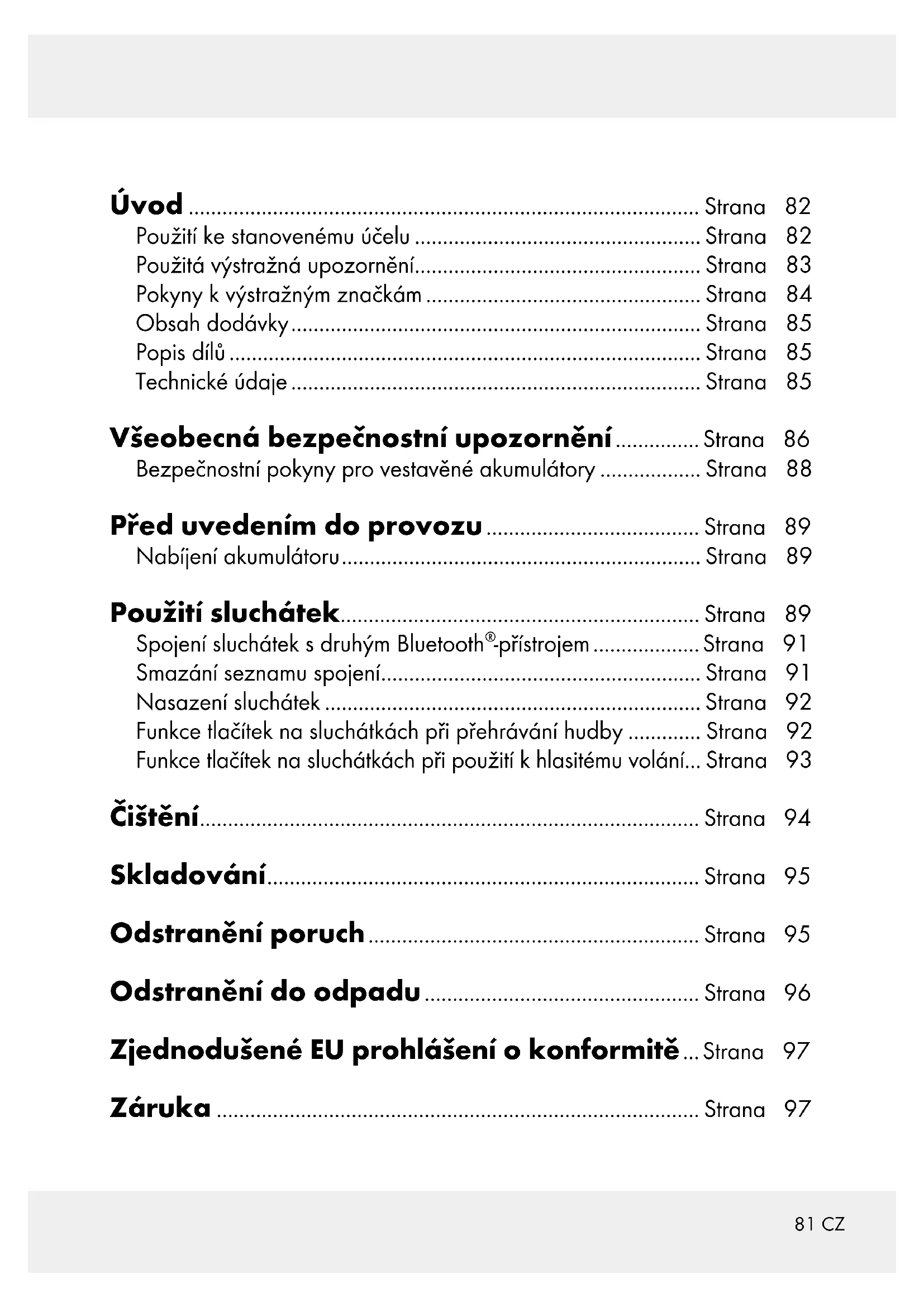 -přístrojem ................... Strana 91 Smazání seznamu spojení ......................................................... Strana 91 Nasazení sluchátek ................................................................... Strana 92 Funkce tlačítek na sluchátkách při přehrávání hudby ............. Strana 92 Funkce tlačítek na sluchátkách při použití k hlasitému volání... Strana 93 Čištění ......................................................................................... Strana 94 Skladování ............................................................................. Strana 95 Odstranění poruch ........................................................... Strana 95 Odstranění do odpadu ................................................. Strana 96 Zjednodušené EU prohlášení o konformitě ... Strana 97 Záruka ...................................................................................... Strana 9782 CZ Bluetooth
