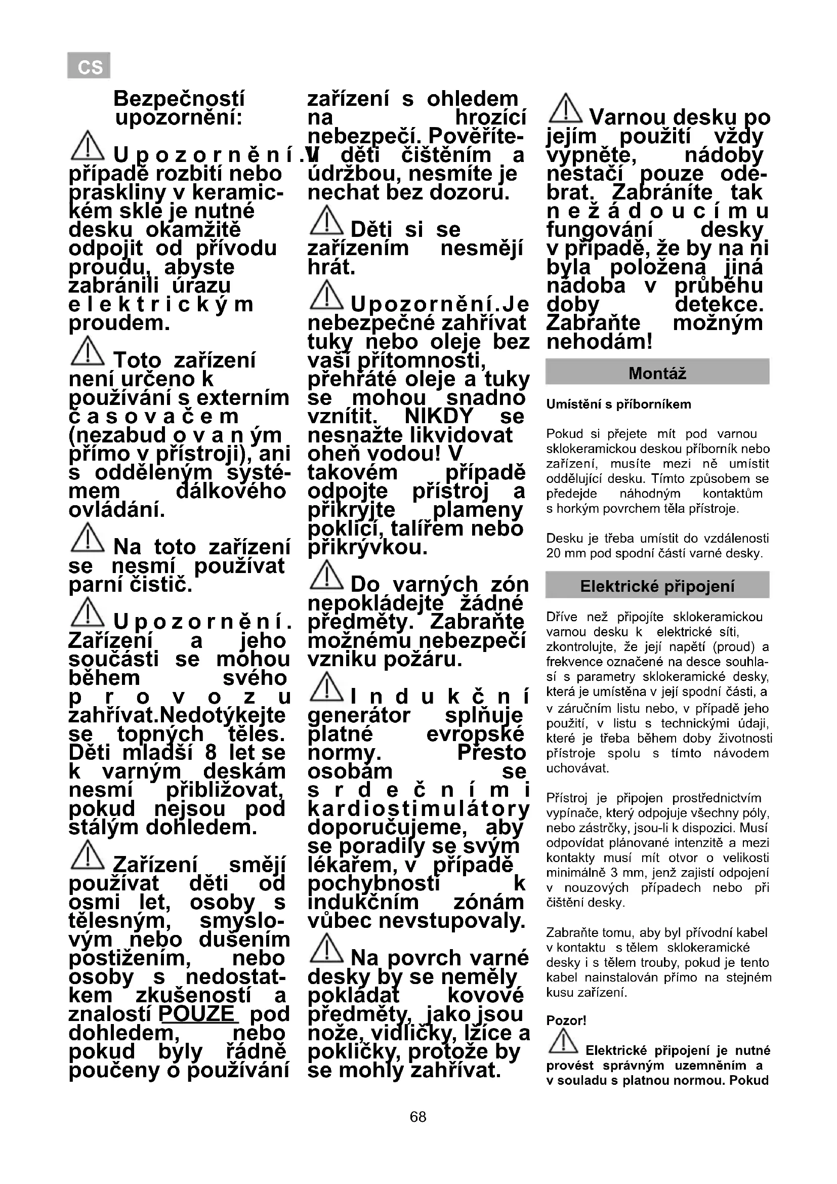 Ha valami nem működik -A készülék tesztelték szabvány szerint EN 60350-2 és az így kapott értéket, Wh/Kg, elérhető a készülék adattábláján. 67CS Bezpečností upozornění: U p o z o r n ě n í .V případě rozbití nebo praskliny v keramic- kém skle je nutné desku okamžitě odpojit od přívodu proudu, abyste zabránili úrazu e l e k t r i c k ý m proudem. Toto zařízení není určeno k používání s externím č a s o v a č e m (nezabud o v a n ým přímo v přístroji), ani s odděleným systé- mem dálkového ovládání. Na toto zařízení se nesmí používat parní čistič. U p o z o r n ě n í . Zařízení a jeho součásti se mohou během svého p r o v o z u zahřívat.Nedotýkejte se topných těles. Děti mladší 8 let se k varným deskám nesmí přibližovat, pokud nejsou pod stálým dohledem. Zařízení smějí používat děti od osmi let, osoby s tělesným, smyslo- vým nebo dušením postižením, nebo osoby s nedostat- kem zkušeností a znalostí POUZE pod dohledem, nebo pokud byly řádně poučeny o používání zařízení s ohledem na hrozící nebezpečí. Pověříte- li děti čištěním a údržbou, nesmíte je nechat bez dozoru. Děti si se zařízením nesmějí hrát. Upozornění.Je nebezpečné zahřívat tuky nebo oleje bez vaší přítomnosti, přehřáté oleje a tuky se mohou snadno vznítit. NIKDY se nesnažte likvidovat oheň vodou! V takovém případě odpojte přístroj a přikryjte plameny poklicí, talířem nebo přikrývkou. Do varných zón nepokládejte žádné předměty. Zabraňte možnému nebezpečí vzniku požáru. I n d u k č n í generátor splňuje platné evropské normy. Přesto osobám se s r d e č n í m i kardiostimulátory doporučujeme, aby se poradily se svým lékařem, v případě pochybností k indukčním zónám vůbec nevstupovaly. Na povrch varné desky by se neměly pokládat kovové předměty, jako jsou nože, vidličky, lžíce a pokličky, protože by se mohly zahřívat. Varnou desku po jejím použití vždy vypněte, nádoby nestačí pouze ode- brat. Zabráníte tak n e ž á d o u c í m u fungování desky v případě, že by na ni byla položena jiná nádoba v průběhu doby detekce. Zabraňte možným nehodám! Montáž Umístění s příborníkem Pokud si přejete mít pod varnou sklokeramickou deskou příborník nebo zařízení, musíte mezi ně umístit oddělující desku. Tímto způsobem se předejde náhodným kontaktům s horkým povrchem těla přístroje. Desku je třeba umístit do vzdálenosti 20 mm pod spodní částí varné desky. Elektrické připojení Dříve než připojíte sklokeramickou varnou desku k elektrické síti, zkontrolujte, že její napětí (proud) a frekvence označené na desce souhla- sí s parametry sklokeramické desky, která je umístěna v její spodní části, a v záručním listu nebo, v případě jeho použití, v listu s technickými údaji, které je třeba během doby životnosti přístroje spolu s tímto návodem uchovávat. Přístroj je připojen prostřednictvím vypínače, který odpojuje všechny póly, nebo zástrčky, jsou-li k dispozici. Musí odpovídat plánované intenzitě a mezi kontakty musí mít otvor o velikosti minimálně 3 mm, jenž zajistí odpojení v nouzových případech nebo při čištění desky. Zabraňte tomu, aby byl přívodní kabel v kontaktu s tělem sklokeramické desky i s tělem trouby, pokud je tento kabel nainstalován přímo na stejném kusu zařízení. Pozor! Elektrické připojení je nutné provést správným uzemněním a v souladu s platnou normou. Pokud 68CS tomu tak není, může sklokeramická deska vykazovat poruchy funkce. Abnormálně vysoké přepětí může způsobit havárii ovládacího systému (tak, jako u všech druhů elektrospotřebičů). Používání indukčního vařiče se nedoporučuje během provádění pyrolytického čištění pro pyrolytické trouby, a to kvůli vysoké teplotě, které tento přístroj dosahuje. Přístroj může opravovat či jakkoli s ním manipulovat pouze oficiální technický servis společnosti TEKA, včetně náhrady pružné přívodní šňůry. Než varnou desku vypojíte ze sítě, doporučuje se vypnout vypínač a vyčkat přibližně 25 vteřin, než vyndáte zástrčku. Tato doba je nutná k celko- vému výboji elektronického okruhu, zamezí se tak možnému elektrickému výboji v kontaktech zástrčky. Po dobu životnosti přístroje si uschovejte jeho záruční list, popř. list s technickými údaji, spolu s návodem. Obsahuje důležité tech- nické informace. Provoz a údržba Návod k použití dotykového ovládání OVLÁDACÍ PRVKY (obr. 2) Snímač zapnutí/vypnutí. Ukazatel zóny. Ukazatele výkonu a/nebo zbytkového tepla*. Snímač pro volbu zóny. Desetinná čárka hodin*. Snímač časovače. Ukazatel časovače. Chybový snímač zbylých snímačů. Desetinná čárka ukazatelů výkonnos- ti a/nebo zbytkového tepla*. Kontrolka ukazatele aktivovaného blokování*. Senzor “mínus” pro snížení výko- nu/zkrácení doby. Senzor “plus” pro zvýšení výkonu/prodloužení doby.