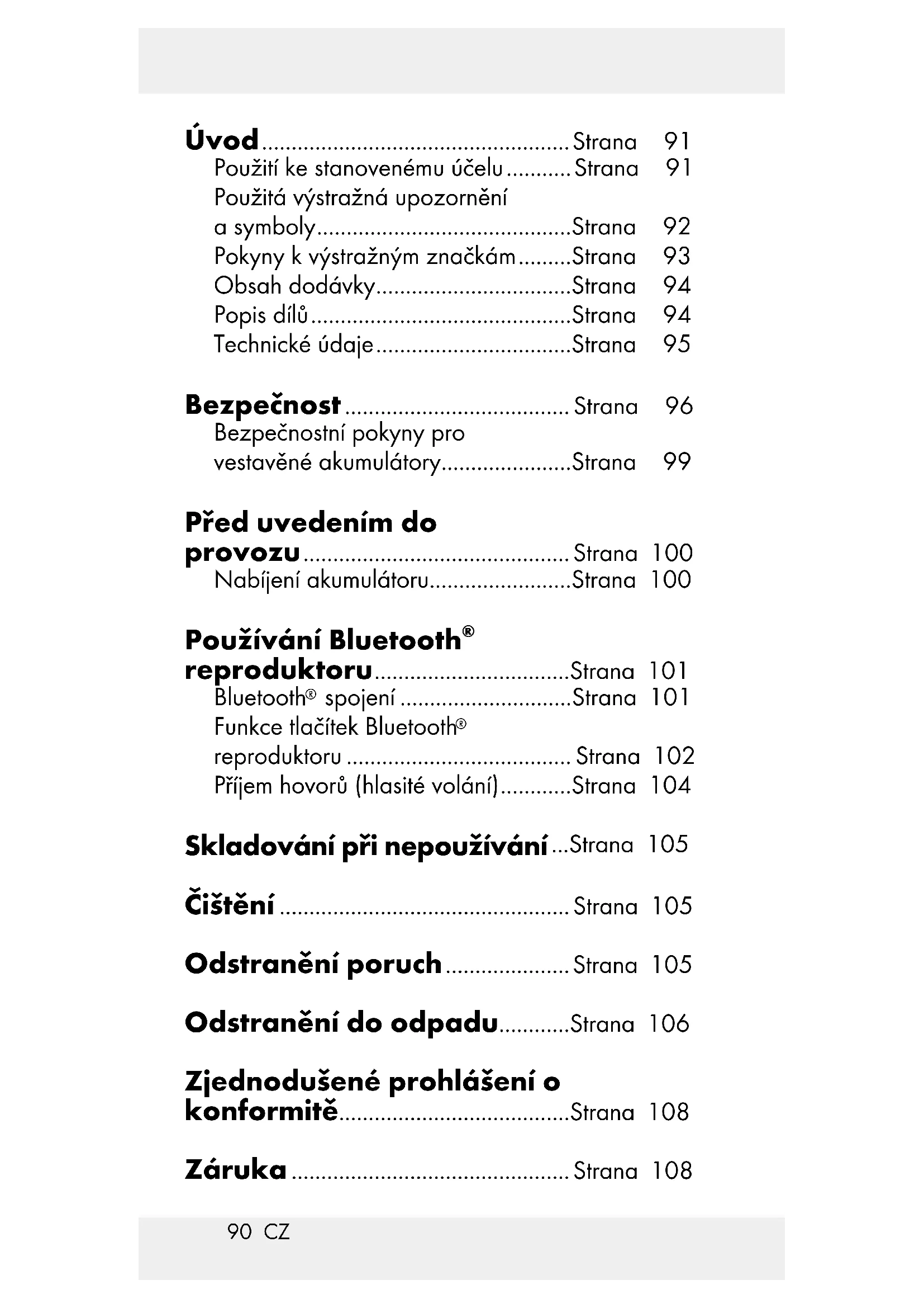 reproduktoru ...................................... Strana 102 Příjem hovorů (hlasité volání) ............Strana 104 Skladování při nepoužívání ...Strana 105 Čištění .................................................Strana 105 Odstranění poruch ..................... Strana 105 Odstranění do odpadu............Strana 106 Zjednodušené prohlášení o konformitě.......................................Strana 108 Záruka ...............................................Strana 10891 CZ Bluetooth