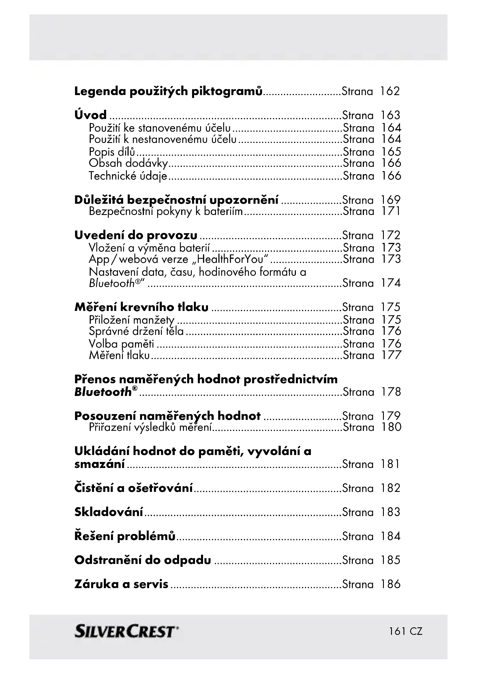 Změny technických dat jsou bez oznámení z důvodu aktualizace vyhrazeny.169 CZ důležitá bezpečnostní upozornění Toto výrobek není vhodný k užívání osobami s omezenými fyzickými, senzorickými nebo duševními schopnostmi nebo s nedostatečnými zkuše- nostmi a nebo vědomostmi, ledaže by byly pod dozo- rem pro bezpečnost kompetentní osoby nebo obdržely od ní instrukce, jak se má výrobek používat. Děti musí být pod dohledem, aby si výrobkem nehrály. Onemocnění kardiovaskulárního systému mohou vést k chybným měřením resp. k ovlivnění přesnosti měření. Stejné je to v případě velmi nízkého tlaku, cukrovky, po- ruch prokrvení a srdečního rytmu, zimnice nebo třesu. Používejte výrobek jen u osob s obvodem nadloktí uda- ným pro výrobek. Vezměte na vědomí že může během pumpování dojít k omezení funkce dotyčné končetiny. Cirkulace krve nesmí být měřením tlaku zbytečně dlouho omezena. Při chybné funkci výrobku sejměte manžetu z paže. Zabraňte mechanickému uskřípnutí, stlačení nebo zlomení hadičky manžety. Vyhýbejte se trvalému tlaku v manžetě stejně jako čas- tému měření. Z toho vyplývající omezení průtoku krve může vést ke zranění. Nepřikládejte manžetu na paži jejíchž tepny a žíly jsou právě léčeny, např. intravaskulárním přístupem resp. in- travaskulární aplikací nebo při arteriovenózním (A-V-) vedlejším připojením.170 CZ Nepřikládejte manžetu osobám po amputaci prsů. Nepřikládejte manžetu na rány, může dojít k dalším zraněním. Přikládejte manžetu jen na nadloktí paže. Nepřikládejte manžetu na jiná místa těla. Pozor: Výrobek se smí používat jen s originální man- žetou. Nepoužívejte akumulátory. Jestliže není jedno z tlačítek 1 minutu použité vypne se tlakoměr automaticky, aby se šetřily baterie. Pozor! Možná poškození výrobku. Tlakoměr obsahuje precizní a elektronické součástky. Přesnost naměřených hodnot a životnost vý- robku je závislá na pečlivém zacházení: Chraňte výrobek před nárazy, vlhkostí, nečistotami, silným kolísáním teploty a přímým sluncem. Nenechte výrobek spadnout. Nepoužívejte výrobek v blízkosti elektromagnetických polí, držte ho mimo dosah rádiových zařízení nebo mobilních telefonů. Používejte jen dodanou nebo originální náhradní man- žetu. Jinak budou měřeny chybné hodnoty. Jestliže nebudete výrobek delší dobu používat, doporu- čuje se z něho vyjmout baterie. Výrobek pravidelně kontrolujte, aby bylo před měřením zajištěno, že nemá žádná viditelná poškození a že jsou jeho baterie dostatečně nabité. V případě pochyb výro- bek nepoužívejte a obraťte se na příslušný servis nebo autorizovaného obchodníka. Nepoužívejte žádné171 CZ přídavné díly, které výrobce nedoporučuje nebo které jsou jako příslušenství nabízeny. V žádném případě nesmíte výrobek otevírat nebo opra- vovat, jinak není zajištěna jeho bezvadná funkce. Při nerespektování zaniká záruka. S potřebnými opravami se obraťte na servis nebo auto- rizovaného obchodníka. Před každou reklamací nejdříve zkontrolujte baterie a popřípadě je vyměňte. Bezpečnostní pokyny k bateriím NEBEZPEČÍ OHROŽENÍ ŽIVOTA! Uchovávejte baterie mimo dosah dětí. Vpřípadě spolknutí okamžitě vyhledejte lékaře! NEBEZPEČÍ VÝBUCHU! Nenabíjecí bate- rie nikdy znovu nenabíjejte. Baterie nezkra- tujte ani je neotevírejte. Může dojít k požáru nebo prasknutí baterií. Nikdy neházejte baterie do ohně nebo do vody. Nevystavujte baterie mechanickému zatížení. Nebezpečí vytečení baterií Zabraňte extrémním podmínkám a teplotám, např. na topení nebo na slunci, které mohou negativně ovlivnit funkci baterií. Vyhýbejte se kontaktu s pokožkou, očima a sliznicemi! Při kontaktu s kyselinou baterií ihned omyjte postižená172 CZ místa dostatečným množstvím čisté vody a okamžitě vyhledejte lékařskou pomoc! NOSIT OCHRANNÉ RUKAVICE! Vyteklé nebo poškozené baterie mohou při kontaktu s pokožkou způsobit její poleptání. Noste proto vhodné ochranné rukavice. V případě vytečení ihned baterie odstraňte z výrobku, abyste zabránili jeho poškození. Používejte pouze baterie stejného typu. Nekombinujte staré baterie snovými! Při delším nepoužívání výrobku z něho vyjměte baterie. Nebezpečí poškození výrobku Používejte výhradně udaný typ baterií! Nasazujte baterie podle označení polarity (+) a (-) na bateriích a na výrobku. Vyčistěte před vložením baterie její kontakty a kontakty v přihrádce na baterie suchým hadrem! Vybité baterie ihned z vyjměte z výrobku. Nepoužívejte akumulátory. Uvedení do provozu Zkontrolujte, jestli jsou v dodávce všechny udané díly. Odstraňte veškerý obalový materiál.173 CZ Vložení a výměna baterií Vysuňte víčko přihrádky na baterie