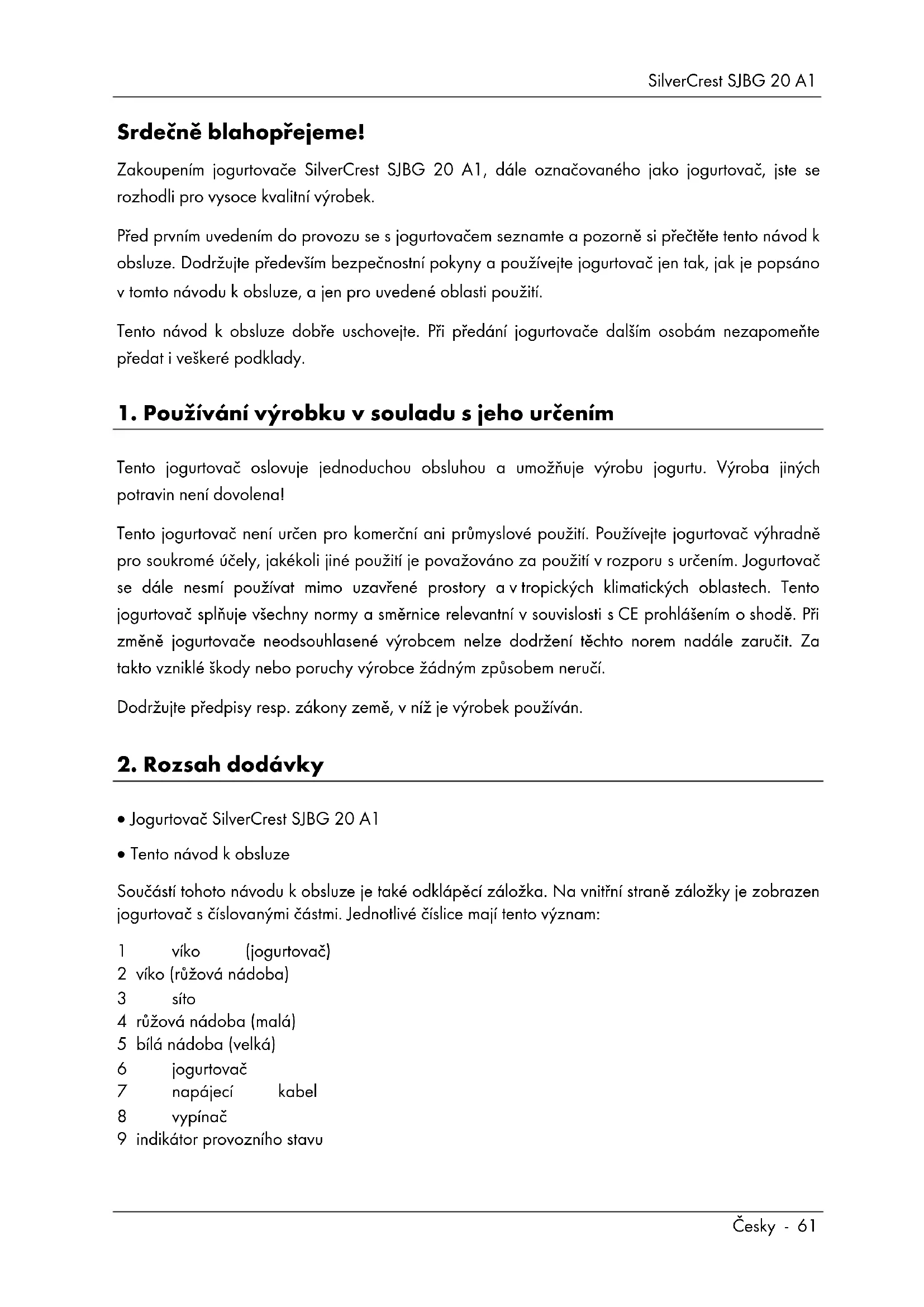 SilverCrest SJBG 20 A1 Česky - 61 Srdečně blahopřejeme! Zakoupením jogurtovače SilverCrest SJBG 20 A1, dále označovaného jako jogurtovač, jste se rozhodli pro vysoce kvalitní výrobek. Před prvním uvedením do provozu se s jogurtovačem seznamte a pozorně si přečtěte tento návod k obsluze. Dodržujte především bezpečnostní pokyny a používejte jogurtovač jen tak, jak je popsáno v tomto návodu k obsluze, a jen pro uvedené oblasti použití. Tento návod k obsluze dobře uschovejte. Při předání jogurtovače dalším osobám nezapomeňte předat i veškeré podklady.