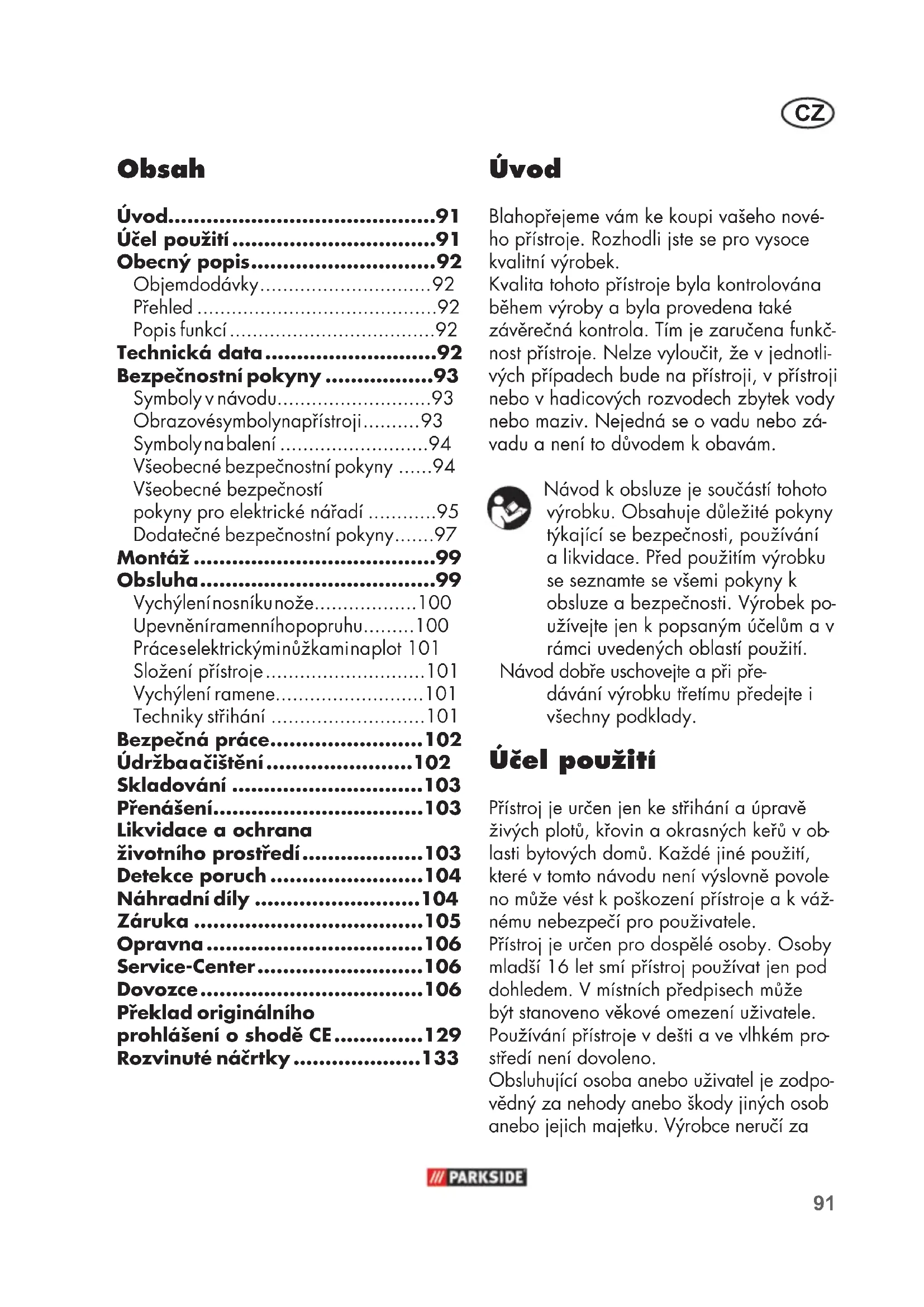 Úvod Blahopřejeme vám ke koupi vašeho nové- ho přístroje. Rozhodli jste se pro vysoce kvalitní výrobek. Kvalita tohoto přístroje byla kontrolována během výroby a byla provedena také závěrečná kontrola. Tím je zaručena funkč- nost přístroje. Nelze vyloučit, že v jednotli- vých případech bude na přístroji, v přístroji nebo v hadicových rozvodech zbytek vody nebo maziv. Nejedná se o vadu nebo zá- vadu a není to důvodem k obavám. Návod k obsluze je součástí tohoto výrobku. Obsahuje důležité pokyny týkající se bezpečnosti, používání a likvidace. Před použitím výrobku se seznamte se všemi pokyny k obsluze a bezpečnosti. Výrobek po- užívejte jen k popsaným účelům a v rámci uvedených oblastí použití. Návod dobře uschovejte a při pře- dávání výrobku třetímu předejte i všechny podklady. Účel použití Přístroj je určen jen ke střihání a úpravě živých plotů, křovin a okrasných keřů v ob