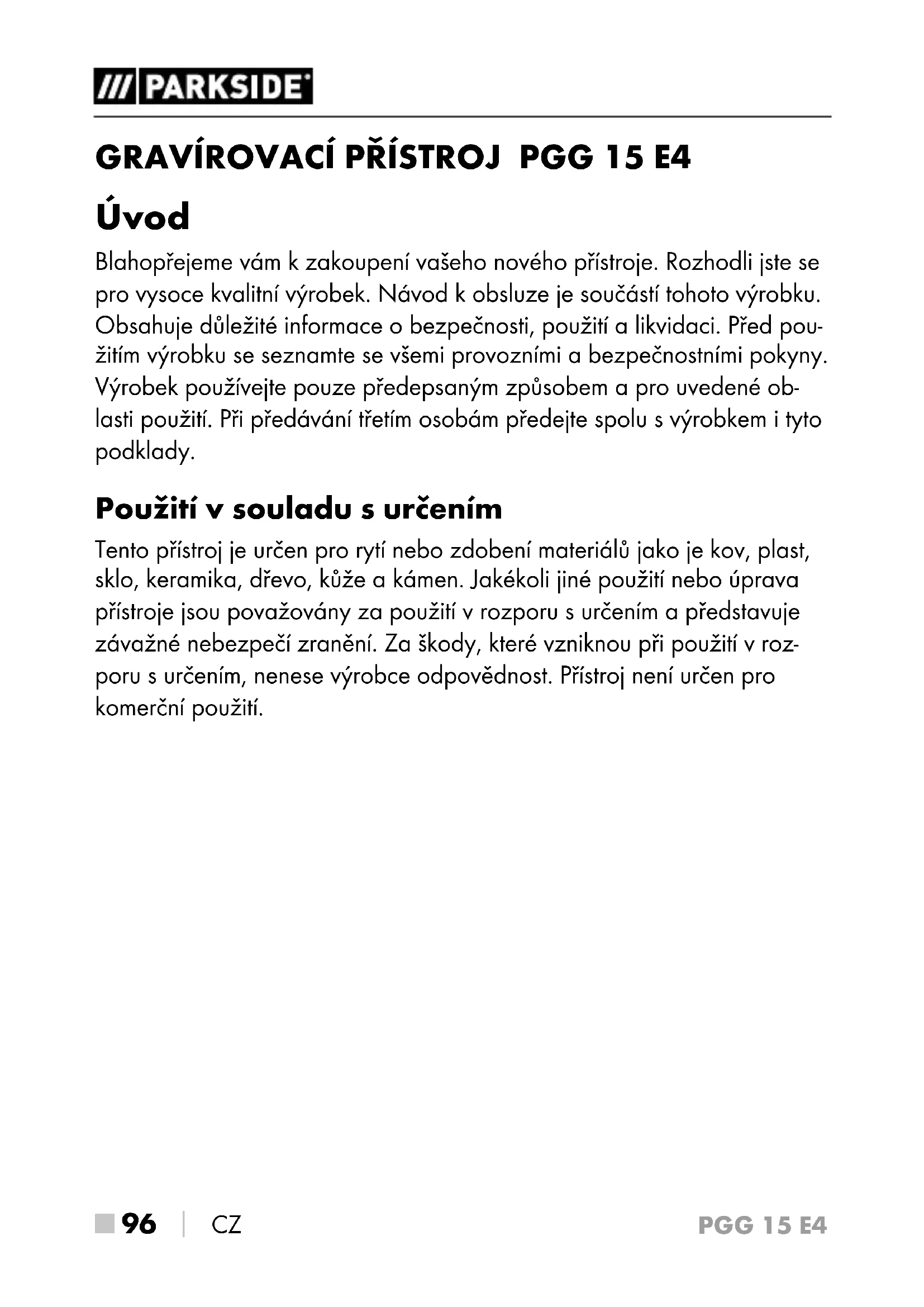 Úvod Blahopřejeme vám kzakoupení vašeho nového přístroje. Rozhodli jste se pro vysoce kvalitní výrobek. Návod kobsluze je součástí tohoto výrobku. Obsahuje důležité informace obezpečnosti, použití a likvidaci. Před pou- žitím výrobku se seznamte se všemi provozními a bezpečnostními pokyny. Výrobek používejte pouze předepsaným způsobem a pro uvedené ob- lasti použití. Při předávání třetím osobám předejte spolu svýrobkem ityto podklady. Použití vsouladu surčením Tento přístroj je určen pro rytí nebo zdobení materiálů jako je kov, plast, sklo, keramika, dřevo, kůže a kámen. Jakékoli jiné použití nebo úprava přístroje jsou považovány za použití vrozporu surčením a představuje závažné nebezpečí zranění. Za škody, které vzniknou při použití vroz- poru surčením, nenese výrobce odpovědnost. Přístroj není určen pro komerční použití.PGG 15 E4 CZ