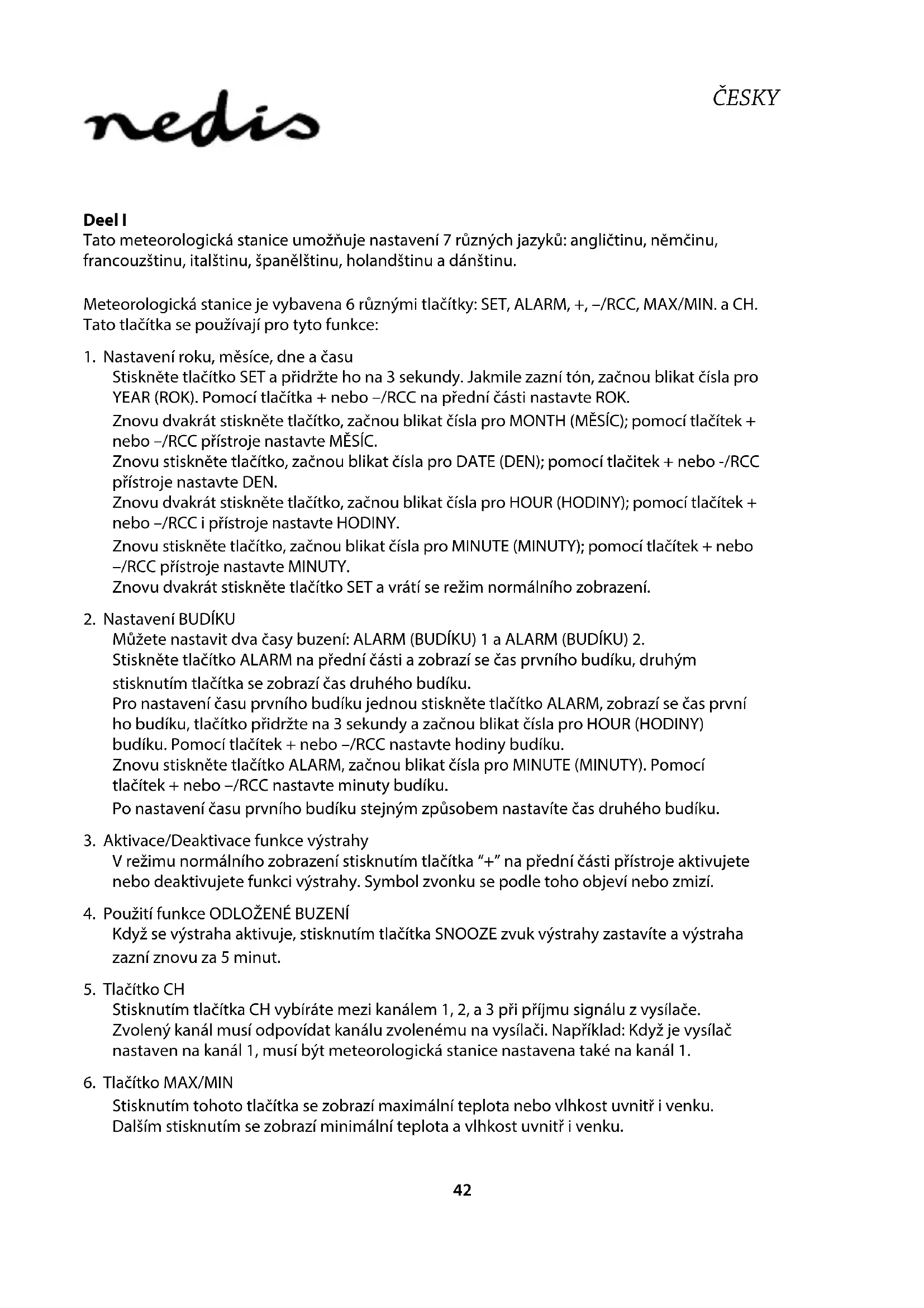 Bezpečnostní opatření: Je-li nutný servis, musí toto zařízení otevřít POUZE autorizovaný technik, aby se snížilo riziko úrazu elektrickým proudem. Dojde-li kporuše, odpojte zařízení odnapájení a od ostatních zařízení. Nevystavujte zařízení působení vody nebo vlhkosti. Údržba: Kčištění používejte pouze suchý hadřík. Nepoužívejte čisticí rozpouštědla ani abrazivní čisticí prostředky. Záruka: Za změny, úpravy nebo poškození zařízení vdůsledku nesprávného zacházení není nesena zodpovědnost a není na ně poskytována záruka. Obecné upozornění: Design a specikace výrobku mohou být změněny bez předchozího upozornění. Všechna loga a obchodní názvy jsou registrované obchodní značky příslušných vlastníků a jsou chráněny zákonem. Pro budoucí použití uschovejte tento návod a obal. Upozornění: Tento výrobek je označen tímto symbolem. To znamená, že se s výrobkem musí zacházet jako s nebezpečným elektrickým a elektronickým odpadem a nelze jej po skončení životnosti vyhazovat s běžným domácím odpadem. Pro likvidaci těchto výrobků existují zvláštní sběrné systémy. Tento produkt byl vyroben a je dodáván v souladu se všemi příslušnými nařízeními a směrnicemi platnými ve všech členských státech Evropské Unie. Splňuje také veškeré relevantní specikace a předpisy státu, ve kterém se prodává. Ociální dokumentaci lze získat na vyžádání. Patří sem např: Prohlášení o shodě (a identikace produktu), materiálový bezpečnostní list, zpráva o testování produktu. V případě dotazů kontaktujte naše oddělení služeb zákazníkům: Webové stránky: http://www.nedis.com/en-us/contact/contact-form.htm E-mail: service@nedis.com Telefon: +31 (0)73-5993965 (během otevírací doby) NEDIS B.V., De Tweeling 28, 5215 MC ’s-Hertogenbosch, NIZOZEMSKO46 ROMÂNĂ Partea I Această staţie meteo are 7 opţiuni de limbă: engleză, germană, franceză, italiană, spaniolă, neerlandeză şi daneză. Staţia meteo dispune de 6 butoane: SET, ALARM, +, –/RCC, MAX/MIN şi CH. Aceste butoane corespund următoarelor funcţii: