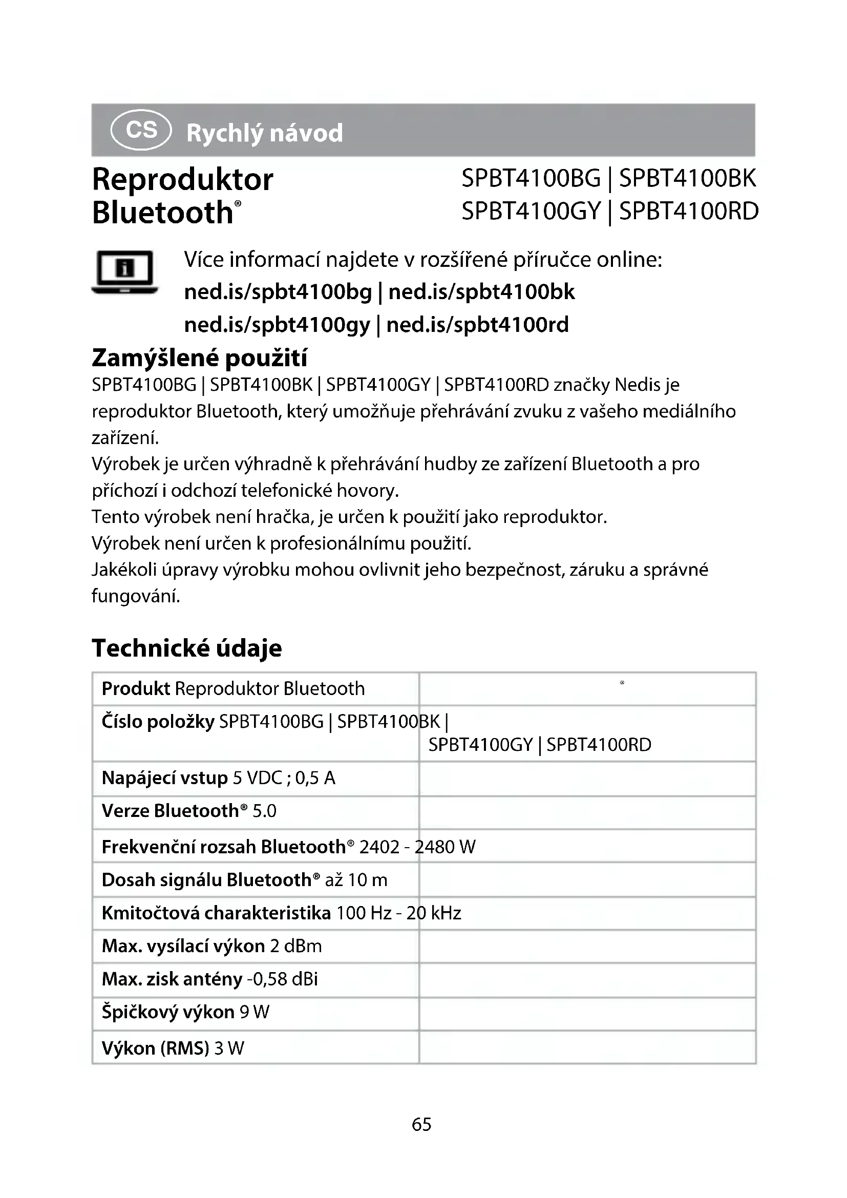 Více informací najdete v rozšířené příručce online: ned.is/spbt4100bg | ned.is/spbt4100bk ned.is/spbt4100gy | ned.is/spbt4100rd Zamýšlené použití SPBT4100BG | SPBT4100BK | SPBT4100GY | SPBT4100RD značky Nedis je reproduktor Bluetooth, který umožňuje přehrávání zvuku zvašeho mediálního zařízení. Výrobek je určen výhradně k přehrávání hudby ze zařízení Bluetooth a pro příchozí i odchozí telefonické hovory. Tento výrobek není hračka, je určen kpoužití jako reproduktor. Výrobek není určen k profesionálnímu použití. Jakékoli úpravy výrobku mohou ovlivnit jeho bezpečnost, záruku a správné fungování. Technické údaje Produkt Reproduktor Bluetooth