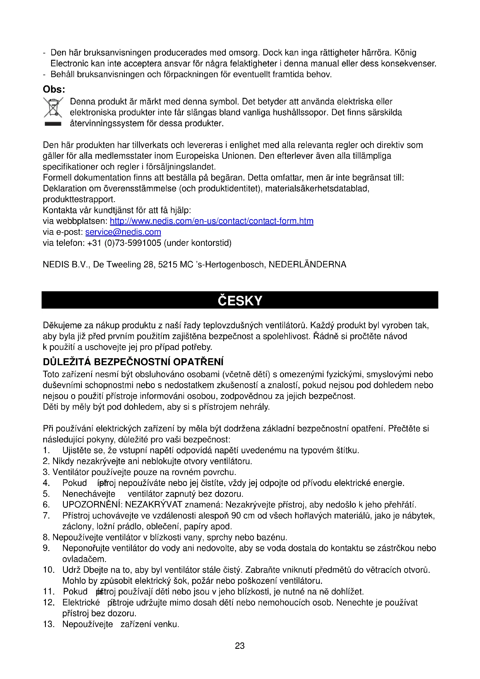 Bezpečnostní opatření: Je-li nutný servis, musí toto zařízení otevřít POUZE autorizovaný technik, aby se snížilo riziko úrazu elektrickým proudem. Dojde-li k poruše, odpojte zařízení od napájení a od ostatních zařízení. Nevystavujte zařízení působení vody nebo vlhkosti. Údržba: K čištění používejte pouze suchý hadřík. Nepoužívejte čisticí rozpouštědla ani abrazivní čisticí prostředky. Záruka: Za změny, úpravy nebo poškození zařízení v důsledku nesprávného zacházení není nesena zodpovědnost a není na ně poskytována záruka. Obecná upozornění: - Design a specifikace výrobku mohou být změněny bez předchozího upozornění. - Všechna loga, značky, loga se značkami a názvy výrobků jsou ochranné známky nebo registrované ochranné známky příslušných vlastníků a jsou chráněny zákonem. - Tento návod byl vyhotoven pečlivě. Přesto z něj nelze odvozovat žádná práva. König Electronic nepřebírá zodpovědnost za za škody vzniklé v souvislosti s chybami v manuálu. - Uschovejte tento návod a obal pro budoucí použití. Upozornění: Výrobek je označen tímto symbolem. To znamená, že vyřazené elektrické nebo elektronické výrobky by neměly být likvidovány společně s běžným domácím odpadem. Pro likvidaci těchto výrobků existují zvláštní sběrné systémy. Tento produkt byl vyroben a je dodáván v souladu se všemi příslušnými nařízeními a směrnicemi platnými ve všech č lenských státech Evropské Unie. Splňuje také veškeré relevantní specifikace a předpisy v zemi prodeje. Oficiální dokumentaci lze získat na vyžádání. Patří sem např: Prohlášení o shodě (a identifikace produktu), materiálový bezpečnostní list, zpráva o testování produktu. V případě dotazů kontaktujte naše oddělení služeb zákazníkům: Webové stránky: http://www.nedis.com/en-us/contact/contact-form.htm E-mail: service@nedis.com Telefon: +31 (0)73-5991005 (během otevírací doby) NEDIS B.V., De Tweeling 28, 5215 MC ’s-Hertogenbosch, NIZOZEMSKO ROMÂNĂ Aerotermă din ceramică Vă mulţumim pentru achiziţia aerotermei fabricate de noi. Fiecare unitate a fost concepută astfel încât să ofere siguranţă şi fiabilitate încă de la prima utilizare. Citiţi cu atenţie instrucţiunile şi păstraţi-le pentru a le consulta pe viitor.