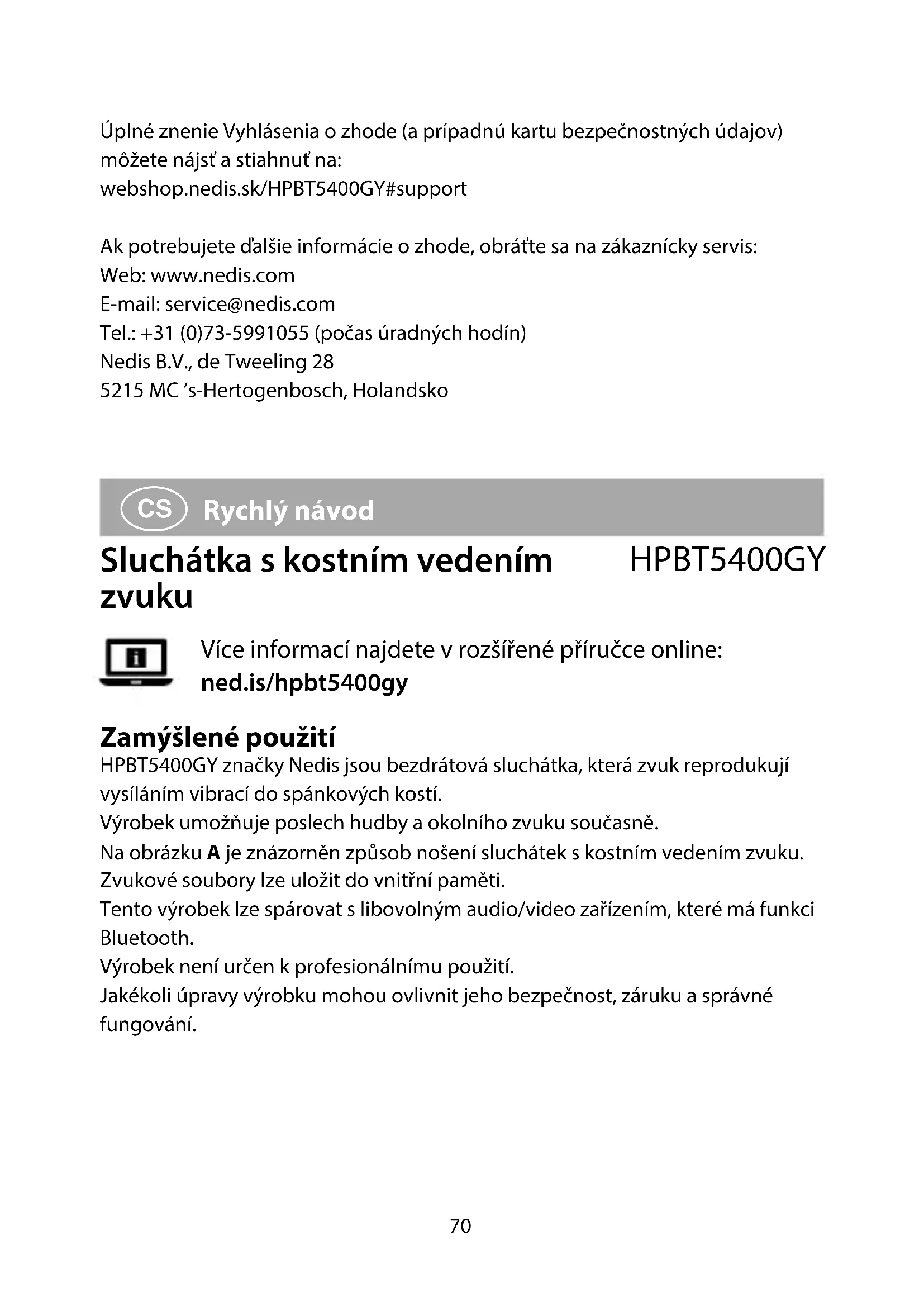 Rychlý návod Sluchátka skostním vedením zvuku HPBT5400GY Více informací najdete v rozšířené příručce online: ned.is/hpbt5400gy Zamýšlené použití HPBT5400GY značky Nedis jsou bezdrátová sluchátka, která zvuk reprodukují vysíláním vibrací do spánkových kostí. Výrobek umožňuje poslech hudby a okolního zvuku současně. Na obrázku A je znázorněn způsob nošení sluchátek skostním vedením zvuku. Zvukové soubory lze uložit do vnitřní paměti. Tento výrobek lze spárovat slibovolným audio/video zařízením, které má funkci Bluetooth. Výrobek není určen k profesionálnímu použití. Jakékoli úpravy výrobku mohou ovlivnit jeho bezpečnost, záruku a správné fungování.71 Technické údaje Produkt Sluchátka skostním vedením zvuku Číslo položky HPBT5400GY Hmotnost 36 g Verze Bluetooth® 5.0 Frekvenční rozsah Bluetooth® 2403–2480MHz Max. vysílací výkon 2 dBm Přenosová vzdálenost Až 10m (bez překážek) Kmitočtová charakteristika 20 - 20000 Hz Impedance 8 Ω Typ baterie Lithium-iontová Kapacita baterie 180 mAh Dobíjecí Ano Doba nabíjení až 2hod. Doba provozu až 4.5hod. Kapacita úložiště 8 GB Napájecí vstup 5 VDC ; 1 A Hlavní části (obrázek A)
