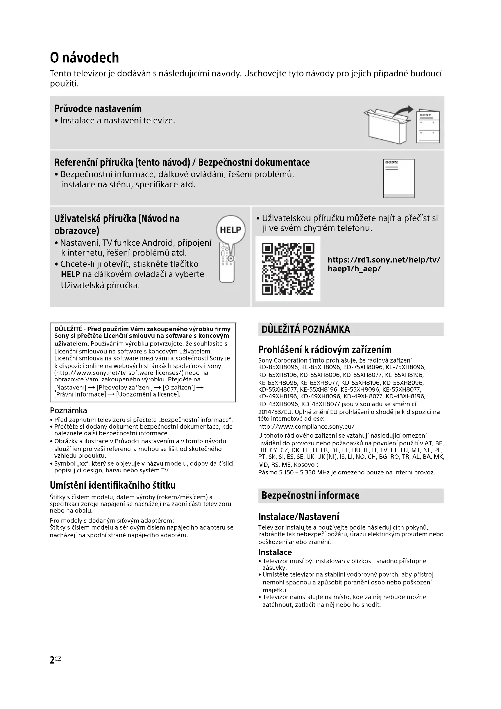 - Uživatelskou příručku můžete najít a přečíst si ji ve svém chytrém telefonu. https://rd1.sony.net/help/tv/ haep1/h_aep/ DŮLEŽITÉ - Před použitím Vámi zakoupeného výrobku firmy Sony si přečtěte Licenční smlouvu na software s koncovým uživatelem. Používáním výrobku potvrzujete, že souhlasíte s Licenční smlouvou na software s koncovým uživatelem. Licenční smlouva na software mezi vámi a společností Sony je k dispozici online na webových stránkách společnosti Sony (http://www.sony.net/tv-software-licenses/) nebo na obrazovce Vámi zakoupeného výrobku. Přejděte na [Nastavení] [Předvolby zařízení] [O zařízení] [Právní informace] [Upozornění a licence].