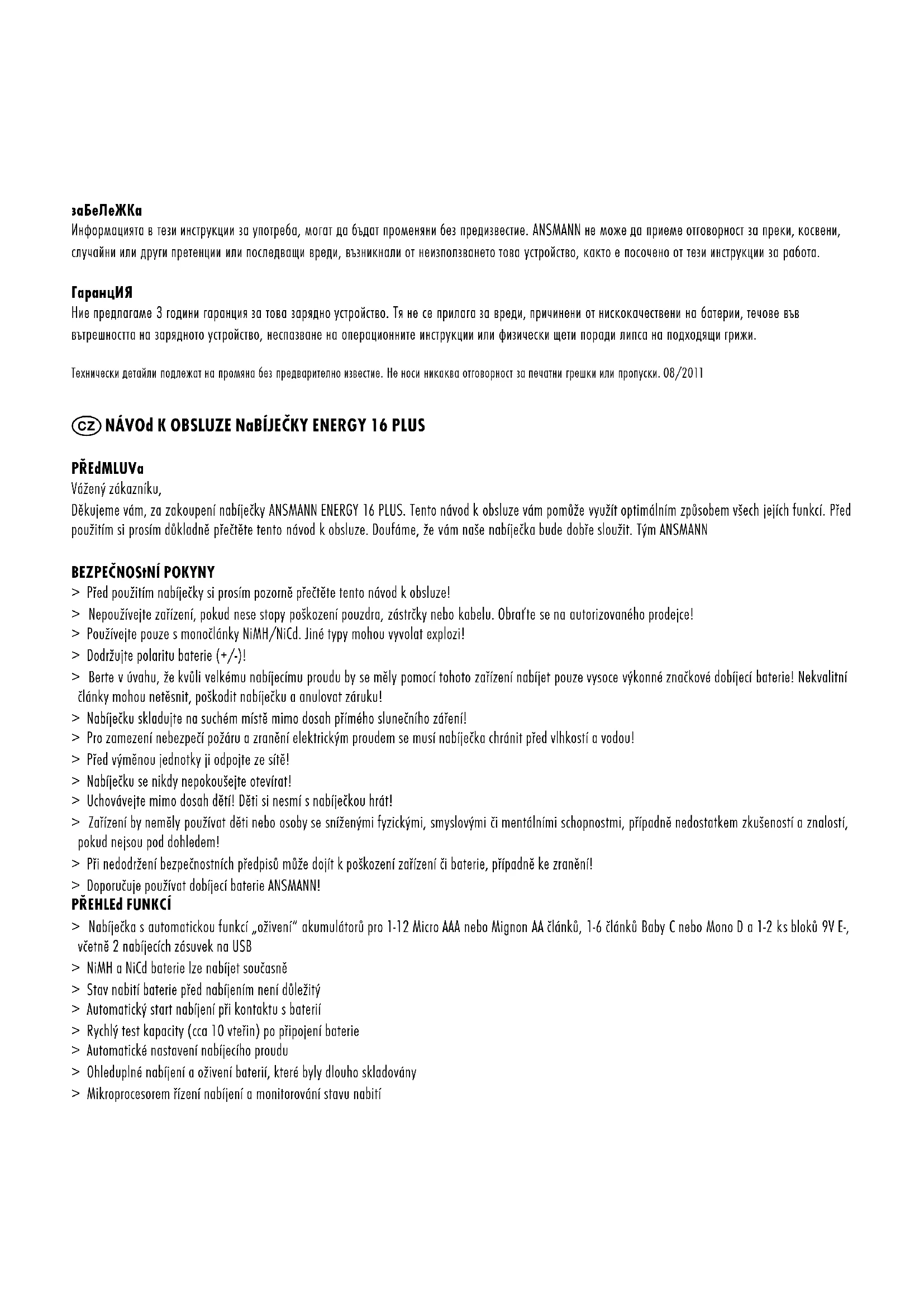 За да се уверите, че зарядното устройство работи правилно, моля да поддържайте чисти контактите в слота за зареждане, от прах или замърсяване. За да почистите уреда го изключете от мрежата и използвайте само суха кърпа. ТЕХНИЧЕСКИ ДАННИ Input: 100-240V / 50-60Hz Клас на защита: II Ток на зареждане: 12 х AAA (микро) / 400mA 12 х AA (Mignon) / 1000mA 6 х C (Baby), D (Mono) / 1000mA 2 х 9V Block / 60mA USB зарядни портове 2x 5V / 1000mA NáVOd K OBSLUZE NaBíjEčKY ENERGY 16 PLUS PŘEdMLUVa Vážený zákazníku, Děkujeme vám, za zakoupení nabíječky ANSMANN ENERGY 16 PLUS. Tento návod k obsluze vám pomůže využít optimálním způsobem všech jejích funkcí. Před použitím si prosím důkladně přečtěte tento návod k obsluze. Doufáme, že vám naše nabíječka bude dobře sloužit. Tým ANSMANN BEZPEčNOStNí POKYNY > Před použitím nabíječky si prosím pozorně přečtěte tento návod k obsluze! > Nepoužívejte zařízení, pokud nese stopy poškození pouzdra, zástrčky nebo kabelu. Obraťte se na autorizovaného prodejce! > Používejte pouze s monočlánky NiMH/NiCd. Jiné typy mohou vyvolat explozi! > Dodržujte polaritu baterie (+/-)! > Berte v úvahu, že kvůli velkému nabíjecímu proudu by se měly pomocí tohoto zařízení nabíjet pouze vysoce výkonné značkové dobíjecí baterie! Nekvalitní články mohou netěsnit, poškodit nabíječku a anulovat záruku! > Nabíječku skladujte na suchém místě mimo dosah přímého slunečního záření! > Pro zamezení nebezpečí požáru a zranění elektrickým proudem se musí nabíječka chránit před vlhkostí a vodou! > Před výměnou jednotky ji odpojte ze sítě! > Nabíječku se nikdy nepokoušejte otevírat! > Uchovávejte mimo dosah dětí! Děti si nesmí s nabíječkou hrát! > Zařízení by neměly používat děti nebo osoby se sníženými fyzickými, smyslovými či mentálními schopnostmi, případně nedostatkem zkušeností a znalostí, pokud nejsou pod dohledem! > Při nedodržení bezpečnostních předpisů může dojít k poškození zařízení či baterie, případně ke zranění! > Doporučuje používat dobíjecí baterie ANSMANN! PŘEHLEd FUNKCí > Nabíječka s automatickou funkcí „oživení“ akumulátorů pro 1-12 Micro AAA nebo Mignon AA článků, 1-6 článků Baby C nebo Mono D a 1-2 ks bloků 9V E-, včetně 2 nabíjecích zásuvek na USB > NiMH a NiCd baterie lze nabíjet současně > Stav nabití baterie před nabíjením není důležitý > Automatický start nabíjení při kontaktu s baterií > Rychlý test kapacity (cca 10 vteřin) po připojení baterie > Automatické nastavení nabíjecího proudu > Ohleduplné nabíjení a oživení baterií, které byly dlouho skladovány > Mikroprocesorem řízení nabíjení a monitorování stavu nabití