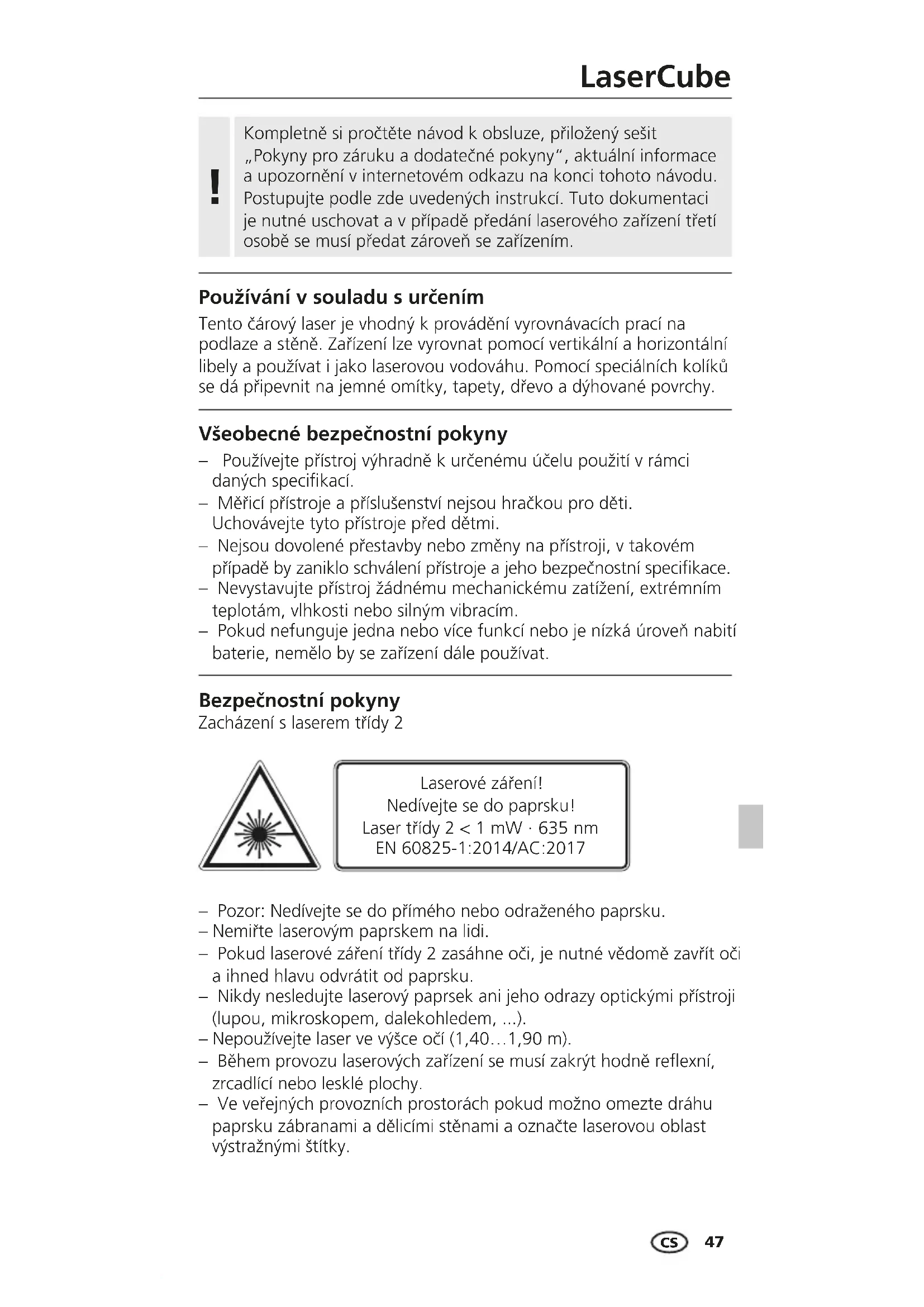Používání v souladu s určením Tento čárový laser je vhodný k provádění vyrovnávacích prací na podlaze a stěně. Zařízení lze vyrovnat pomocí vertikální a horizontální libely a používat i jako laserovou vodováhu. Pomocí speciálních kolíků se dá připevnit na jemné omítky, tapety, dřevo a dýhované povrchy. Všeobecné bezpečnostní pokyny – Používejte přístroj výhradně k určenému účelu použití v rámci daných specikací. – Měřicí přístroje a příslušenství nejsou hračkou pro děti. Uchovávejte tyto přístroje před dětmi. – Nejsou dovolené přestavby nebo změny na přístroji, v takovém případě by zaniklo schválení přístroje a jeho bezpečnostní specikace. – Nevystavujte přístroj žádnému mechanickému zatížení, extrémním teplotám, vlhkosti nebo silným vibracím. – Pokud nefunguje jedna nebo více funkcí nebo je nízká úroveň nabití baterie, nemělo by se zařízení dále používat. – Pozor: Nedívejte se do přímého nebo odraženého paprsku. – Nemiřte laserovým paprskem na lidi. – Pokud laserové záření třídy 2 zasáhne oči, je nutné vědomě zavřít oči a ihned hlavu odvrátit od paprsku. – Nikdy nesledujte laserový paprsek ani jeho odrazy optickými přístroji (lupou, mikroskopem, dalekohledem, ...). – Nepoužívejte laser ve výšce očí (1,40…1,90 m). – Během provozu laserových zařízení se musí zakrýt hodně reexní, zrcadlící nebo lesklé plochy. – Ve veřejných provozních prostorách pokud možno omezte dráhu paprsku zábranami a dělicími stěnami a označte laserovou oblast výstražnými štítky. Bezpečnostní pokyny Zacházení s laserem třídy 2 Laserové záření! Nedívejte se do paprsku! Laser třídy 2 < 1 mW · 635 nm EN 60825-1:2014/AC:2017CS
