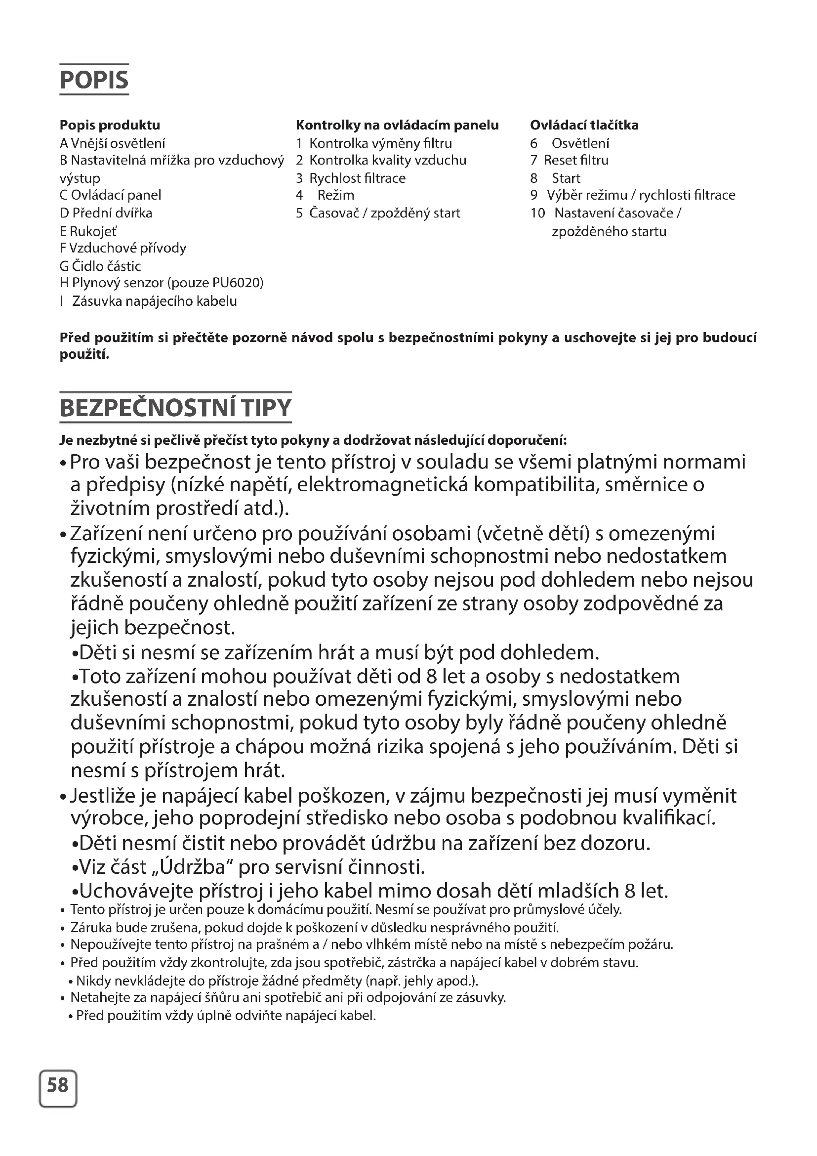 - aparatul nu funcionează corect SĂ PROTEJĂM MEDIUL! Aparatul dumneavoastră conine materiale valoroase care pot recuperate sau reciclate. Predai-l la un punct local de colectare a deeurilor sau ducei-l la un centru de service autorizat pentru a procesat.58 POPIS Popis produktu A Vnější osvětlení B Nastavitelná mřížka pro vzduchový výstup C Ovládací panel D Přední dvířka E Rukojeť F Vzduchové přívody G Čidlo částic H Plynový senzor (pouze PU6020) I Zásuvka napájecího kabelu Kontrolky na ovládacím panelu 1 Kontrolka výměny ltru 2 Kontrolka kvality vzduchu 3 Rychlost ltrace 4 Režim 5 Časovač / zpožděný start Ovládací tlačítka 6 Osvětlení 7 Reset ltru 8 Start 9 Výběr režimu / rychlosti ltrace 10 Nastavení časovače / zpožděného startu Před použitím si přečtěte pozorně návod spolu s bezpečnostními pokyny a uschovejte si jej pro budoucí použití.