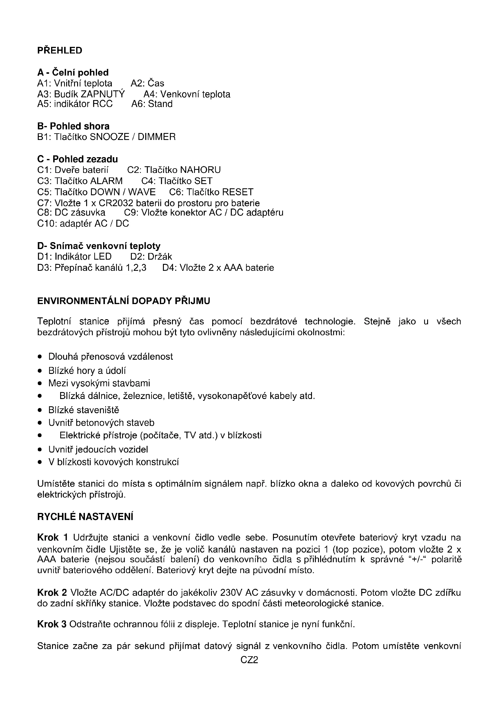 TEPLOTNÍ STANICE LED S RÁDIOVĚ ŘÍZENÝMI HODINAMI A BUDÍKEMCZ2 PŘEHLED A - Čelní pohled A1: Vnitřní teplota A2: Čas A3: Budík ZAPNUTÝ A4: Venkovní teplota A5: indikátor RCC A6: Stand B- Pohled shora B1: Tlačítko SNOOZE / DIMMER C - Pohled zezadu C1: Dveře baterií C2: Tlačítko NAHORU C3: Tlačítko ALARM C4: Tlačítko SET C5: Tlačítko DOWN / WAVE C6: Tlačítko RESET C7: Vložte 1 x CR2032 baterii do prostoru pro baterie C8: DC zásuvka C9: Vložte konektor AC / DC adaptéru C10: adaptér AC / DC D- Snímač venkovní teploty D1: Indikátor LED D2: Držák D3: Přepínač kanálů 1,2,3 D4: Vložte 2 x AAA baterie