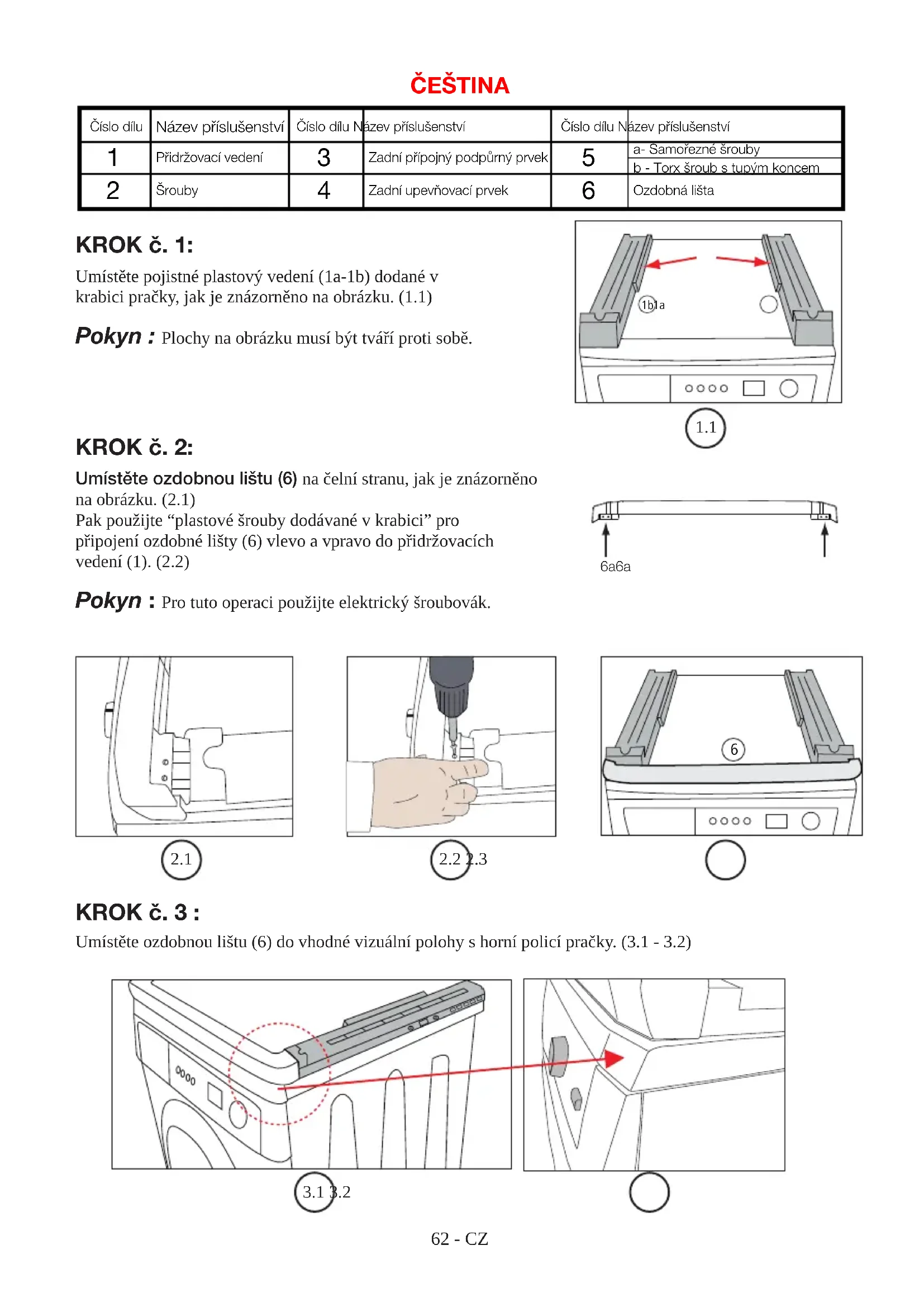 4a62 - CZ KROK č. 1: Umístěte pojistné plastový vedení (1a-1b) dodané v krabici pračky, jak je znázorněno na obrázku. (1.1) Pokyn : Plochy na obrázku musí být tváří proti sobě. KROK č. 2: Umístěte ozdobnou lištu (6) na čelní stranu, jak je znázorněno na obrázku. (2.1) Pak použijte “plastové šrouby dodávané v krabici” pro připojení ozdobné lišty (6) vlevo a vpravo do přidržovacích vedení (1). (2.2) Pokyn : Pro tuto operaci použijte elektrický šroubovák. KROK č. 3 : Umístěte ozdobnou lištu (6) do vhodné vizuální polohy s horní policí pračky. (3.1 - 3.2) Číslo díluNázev příslušenství Přidržovací vedení ŠroubyČíslo dílu Název příslušenství Zadní přípojný podpůrný prvek Zadní upevňovací prvekČíslo dílu Název příslušenství a- Samořezné šroubyb - Torx šroub s tupým koncem Ozdobná lišta1b 1a 6a 6a