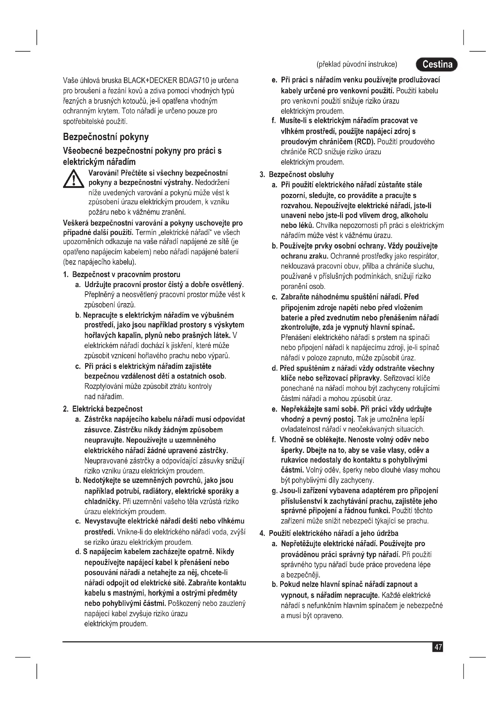(překlad původní instrukce) Cestina (překlad původní instrukce) Vaše úhlová bruska BLACK+DECKER BDAG710 je určena pro broušení a řezání kovů a zdiva pomocí vhodných typů řezných a brusných kotoučů, je-li opatřena vhodným ochranným krytem. Toto nářadí je určeno pouze pro spotřebitelské použití. Bezpečnostní pokyny Všeobecné bezpečnostní pokyny pro práci s elektrickým nářadím
