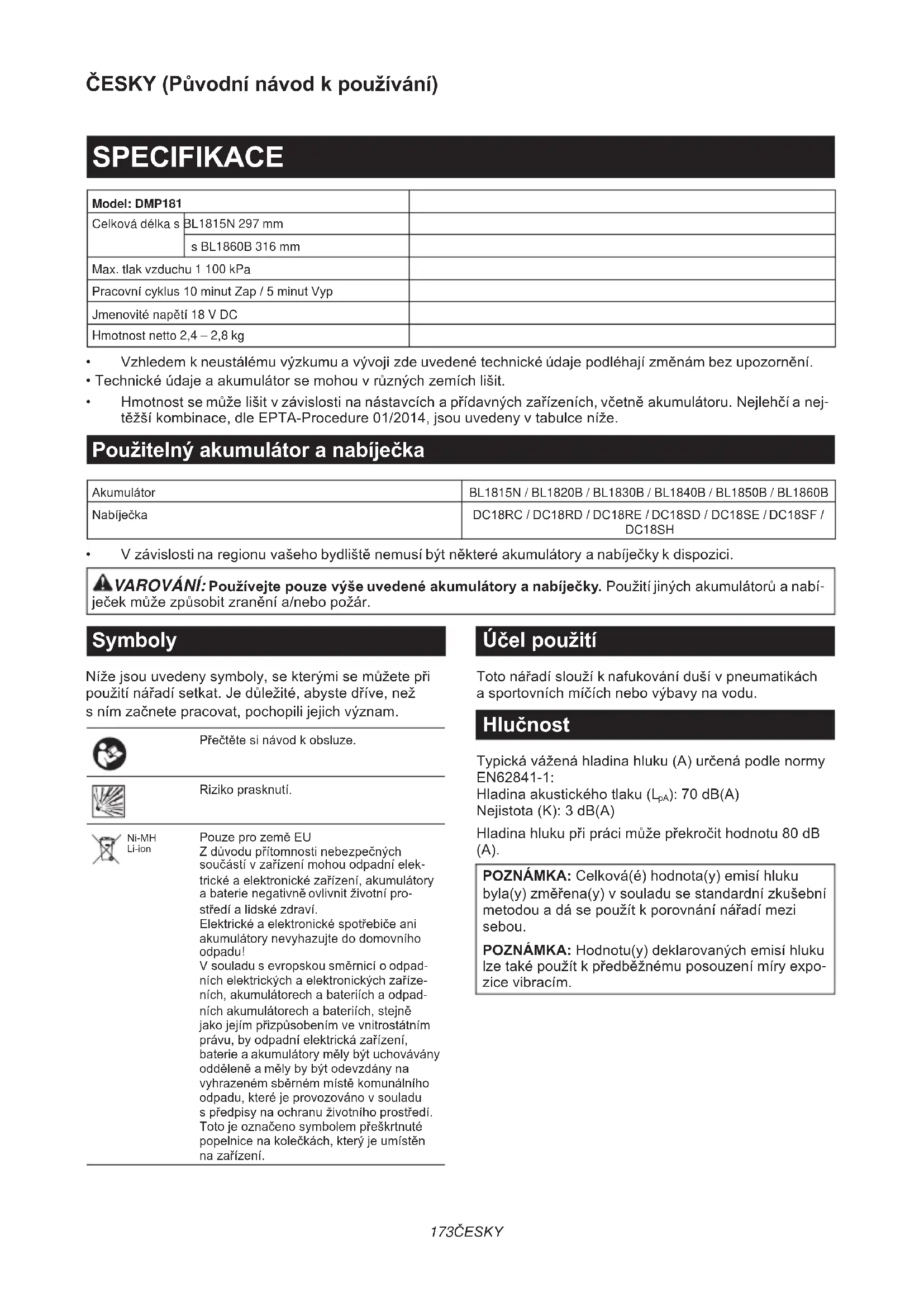 - V závislosti na regionu vašeho bydliště nemusí být některé akumulátory a nabíječky k dispozici. VAROVÁNÍ: Používejte pouze výše uvedené akumulátory a nabíječky. Použití jiných akumulátorů a nabí- ječek může způsobit zranění a/nebo požár. Symboly Níže jsou uvedeny symboly, se kterými se můžete při použití nářadí setkat. Je důležité, abyste dříve, než s ním začnete pracovat, pochopili jejich význam. Přečtěte si návod k obsluze. Riziko prasknutí. Ni-MH Li-ion Pouze pro země EU Z důvodu přítomnosti nebezpečných součástí v zařízení mohou odpadní elek- trické a elektronické zařízení, akumulátory a baterie negativně ovlivnit životní pro- středí a lidské zdraví. Elektrické a elektronické spotřebiče ani akumulátory nevyhazujte do domovního odpadu! V souladu s evropskou směrnicí o odpad- ních elektrických a elektronických zaříze- ních, akumulátorech a bateriích a odpad- ních akumulátorech a bateriích, stejně jako jejím přizpůsobením ve vnitrostátním právu, by odpadní elektrická zařízení, baterie a akumulátory měly být uchovávány odděleně a měly by být odevzdány na vyhrazeném sběrném místě komunálního odpadu, které je provozováno v souladu s předpisy na ochranu životního prostředí. Toto je označeno symbolem přeškrtnuté popelnice na kolečkách, který je umístěn na zařízení. Účel použití Toto nářadí slouží k nafukování duší v pneumatikách a sportovních míčích nebo výbavy na vodu. Hlučnost Typická vážená hladina hluku (A) určená podle normy EN62841-1: Hladina akustického tlaku (L