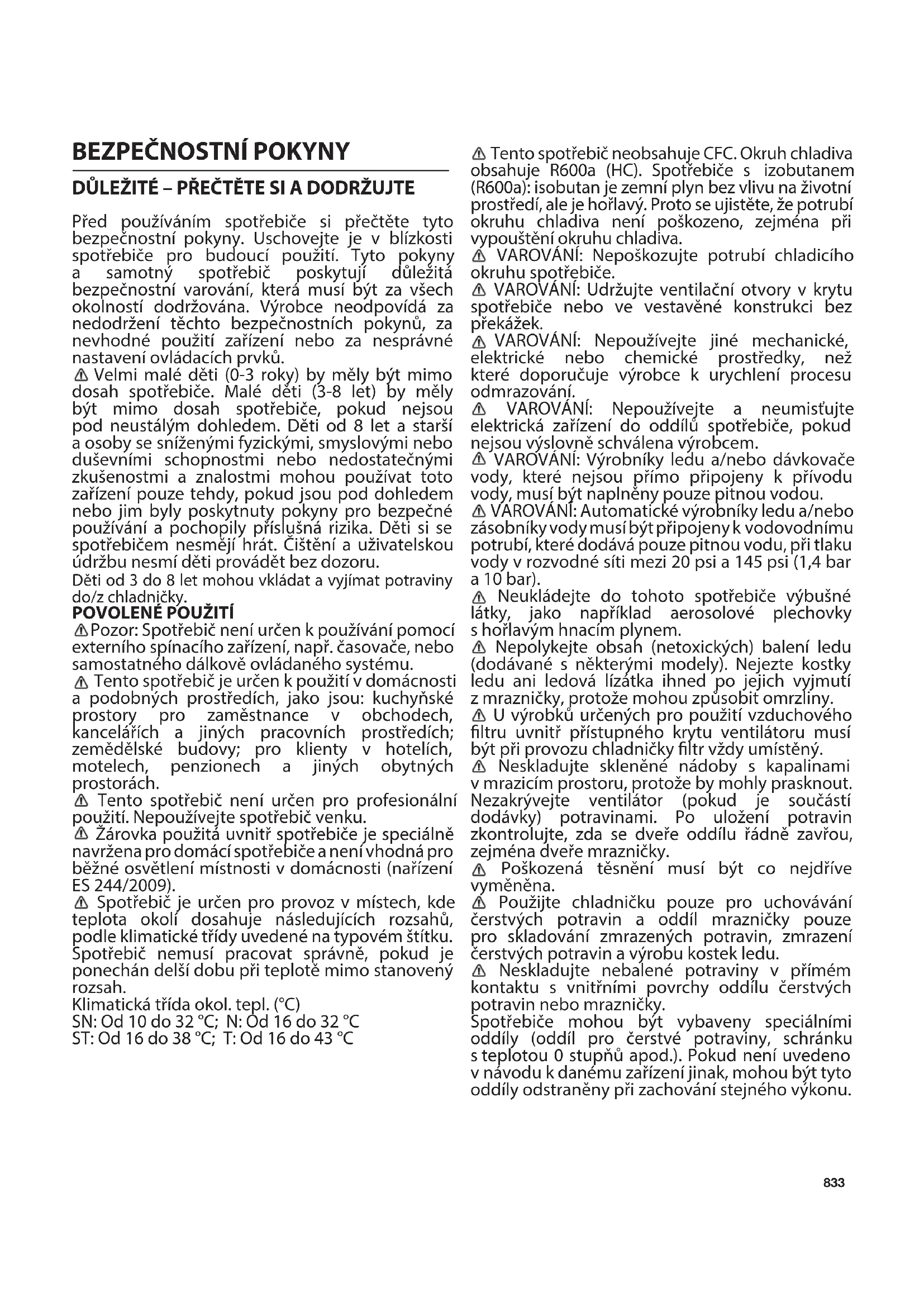 Pozor: Spotřebič není určen k používání pomocí externího spínacího zařízení, např. časovače, nebo samostatného dálkově ovládaného systému. Tento spotřebič je určen k použití v domácnosti a podobných prostředích, jako jsou: kuchyňské prostory pro zaměstnance v obchodech, kancelářích a jiných pracovních prostředích; zemědělské budovy; pro klienty v hotelích, motelech, penzionech a jiných obytných prostorách. Tento spotřebič není určen pro profesionální použití. Nepoužívejte spotřebič venku. Žárovka použitá uvnitř spotřebiče je speciálně navržena pro domácí spotřebiče a není vhodná pro běžné osvětlení místnosti v domácnosti (nařízení ES 244/2009). Spotřebič je určen pro provoz v místech, kde teplota okolí dosahuje následujících rozsahů, podle klimatické třídy uvedené na typovém štítku. Spotřebič nemusí pracovat správně, pokud je ponechán delší dobu při teplotě mimo stanovený rozsah. Klimatická třída okol. tepl. (°C) SN: Od 10 do 32 °C; N: Od 16 do 32 °C ST: Od 16 do 38 °C; T: Od 16 do 43 °C Tento spotřebič neobsahuje CFC. Okruh chladiva obsahuje R600a (HC). Spotřebiče s izobutanem (R600a): isobutan je zemní plyn bez vlivu na životní prostředí, ale je hořlavý. Proto se ujistěte, že potrubí okruhu chladiva není poškozeno, zejména při vypouštění okruhu chladiva. VAROVÁNÍ: Nepoškozujte potrubí chladicího okruhu spotřebiče. VAROVÁNÍ: Udržujte ventilační otvory v krytu spotřebiče nebo ve vestavěné konstrukci bez překážek. VAROVÁNÍ: Nepoužívejte jiné mechanické, elektrické nebo chemické prostředky, než které doporučuje výrobce k urychlení procesu odmrazování. VAROVÁNÍ: Nepoužívejte a neumisťujte elektrická zařízení do oddílů spotřebiče, pokud nejsou výslovně schválena výrobcem. VAROVÁNÍ: Výrobníky ledu a/nebo dávkovače vody, které nejsou přímo připojeny k přívodu vody, musí být naplněny pouze pitnou vodou. VAROVÁNÍ: Automatické výrobníky ledu a/nebo zásobníky vody musí být připojeny kvodovodnímu potrubí, které dodává pouze pitnou vodu, při tlaku vody v rozvodné síti mezi 20 psi a 145psi (1,4 bar a 10bar). Neukládejte do tohoto spotřebiče výbušné látky, jako například aerosolové plechovky shořlavým hnacím plynem. Nepolykejte obsah (netoxických) balení ledu (dodávané s některými modely). Nejezte kostky ledu ani ledová lízátka ihned po jejich vyjmutí zmrazničky, protože mohou způsobit omrzliny. U výrobků určených pro použití vzduchového ltru uvnitř přístupného krytu ventilátoru musí být při provozu chladničky ltr vždy umístěný. Neskladujte skleněné nádoby s kapalinami vmrazicím prostoru, protože by mohly prasknout. Nezakrývejte ventilátor (pokud je součástí dodávky) potravinami. Po uložení potravin zkontrolujte, zda se dveře oddílu řádně zavřou, zejména dveře mrazničky. Poškozená těsnění musí být co nejdříve vyměněna. Použijte chladničku pouze pro uchovávání čerstvých potravin a oddíl mrazničky pouze pro skladování zmrazených potravin, zmrazení čerstvých potravin a výrobu kostek ledu. Neskladujte nebalené potraviny v přímém kontaktu s vnitřními povrchy oddílu čerstvých potravin nebo mrazničky. Spotřebiče mohou být vybaveny speciálními oddíly (oddíl pro čerstvé potraviny, schránku steplotou 0 stupňů apod.). Pokud není uvedeno vnávodu k danému zařízení jinak, mohou být tyto oddíly odstraněny při zachování stejného výkonu.834 Varování: Riziko požáru/hořlavých materiálů Nejvhodnější prostory spotřebiče, ve kterých mají být skladovány určité druhy potravin, s přihlédnutím k rozdílnému rozložení teploty vrůzných oddílech ve spotřebiči, jsou následující: - Chladnička: Skladujte tropické ovoce, plechovky, nápoje, vejce, omáčky, nakládané okurky, máslo, džem, sýr, mléko, mléčné výrobky, jogurty. Můžete také skladovat uzeniny, dezerty, maso a ryby, tvarohový koláč, čerstvé těstoviny, zakysanou smetanu, pudink a smetanový sýr. Zásuvka na ovoce a zeleninu ve spodní části chladničky: Skladujte zeleninu a ovoce (kromě tropického ovoce). Chladicí oddíl: Maso a ryby skladujte pouze vnejchladnější zásuvce - Mraznička: je vhodná k zmrazování potravin z okolní teploty a ke skladování zmrazených potravin, protože teplota je rovnoměrně rozložena v celém oddílu. U zakoupených zmrazených potravin je doba použitelnosti uvedená na obalu. Toto datum zohledňuje druh skladovaných potravin, a proto by toto datum mělo být respektováno. Čerstvé potraviny by měly být skladovány v následujících časových obdobích: 1-3 měsíce pro sýry, měkkýše, zmrzlinu, šunku/klobásy, mléko, čerstvé tekutiny; 4 měsíce pro steaky nebo kotlety (hovězí, jehněčí, vepřové); 6 měsíců pro máslo nebo margarín, drůbež (kuře, krůta); 8-12 měsíců pro ovoce (kromě citrusů), pečené maso (hovězí, vepřové, jehněčí), zeleninu. Je třeba dodržet data trvanlivosti na obalu potravin. Chcete-li zabránit kontaminaci potravin, dodržujte následující: - Dlouhé otevírání dvířek může způsobit výrazné zvýšení teploty v oddílech spotřebiče. - Pravidelně čistěte povrchy, které mohou přijít do styku s potravinami a přístupnými odtokovými systémy. - Vyčistěte nádrže na čistou vodu, pokud nebyly použity po dobu 48 hodin; pokud nebyla voda odebírána po dobu 5 dnů, propláchněte vodní systém připojený k přívodu vody. - Syrové maso a ryby skladujte ve vhodných nádobách v chladničce, aby se nedostaly do kontaktu s jinými potravinami ani z nich na ně nic nekapalo. V multifunkčním úložném prostoru by se měly potraviny skladovat takto: +10 °C : skladujte bílé víno + 4 °C: skladujte zeleninu a ovoce (kromě tropického ovo