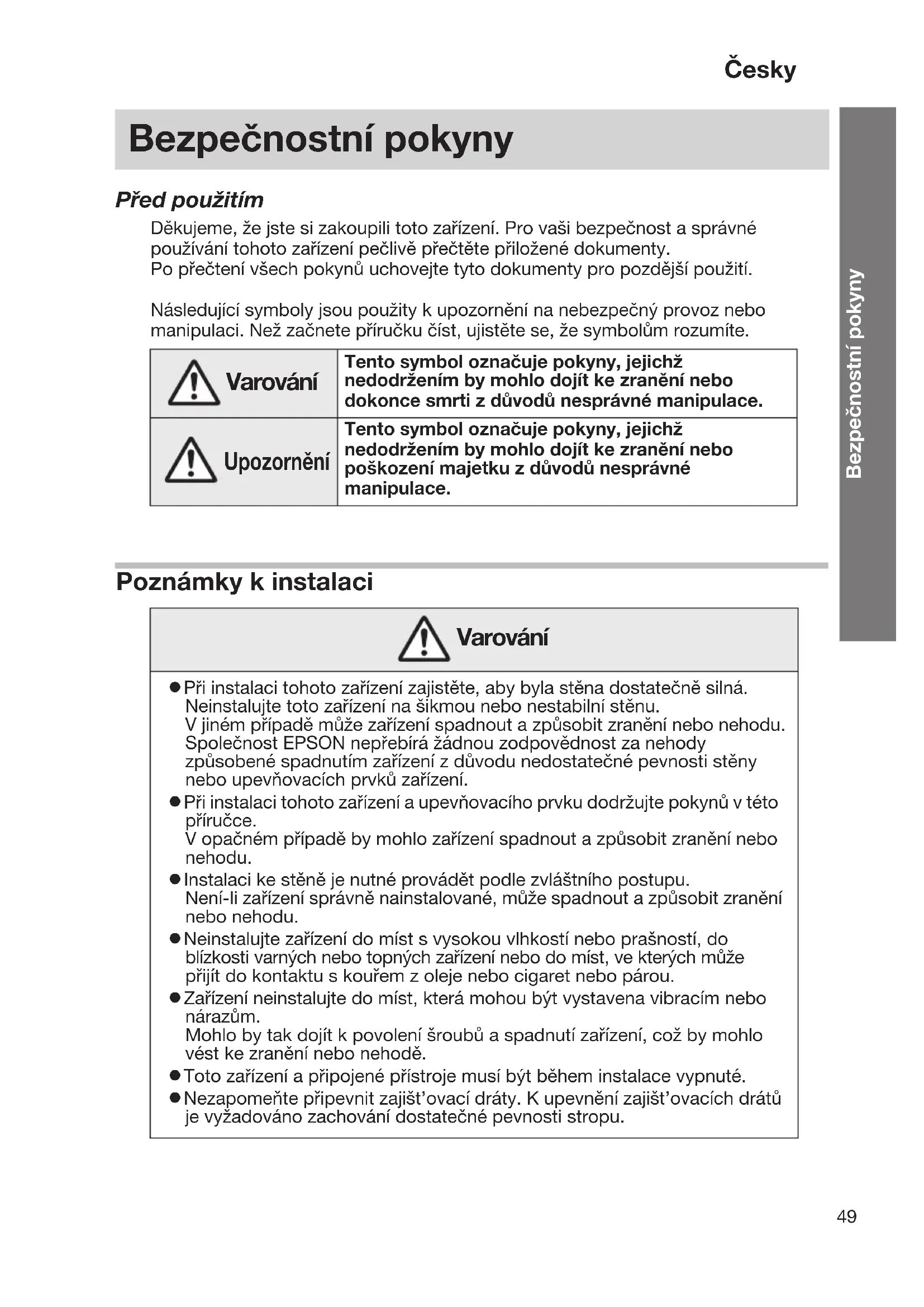 - Dra inte i strömkabeln när du kopplar ur kontakten. Se till att hålla i kontakten när du kopplar ur den. v Använd inte en skadad strömkabel. Detta kan i så fall orsaka brand eller elstöt. Om strömkabeln är skadad (oskyddad ledning, bruten eller liknande), kontakta din återförsäljare eller ditt Epson-kundservicecenter. v Lyssna inte på öronbedövande ljud med hög volym under en längre tid. Om du gör det kan det inverka negativt på din hörförmåga. Försiktighet v Vrid inte upp volymen för högt i början. Öronbedövande höga ljud kan i så fall komma plötsligt och skada din hörförmåga. Se till att sänka volymen tillräckligt innan du matar in ljud från den anslutna enheten, och vrid upp den gradvis. v Använd inte högtalarna med en hög ljudvolym kontinuerligt. Deras ljudegenskaper kan i så fall försämras och deras livslängd kan förkortas extremt mycket. v Rengör produkten med jämna mellanrum. Om produkten inte rengjorts under en längre tid kan damm ansamlas, vilket kan orsaka brand eller elstöt. v Koppla ur alla kablar från produkten före rengöring. v När du rengör produkten, använd inte en fuktad trasa eller lösningsmedel som alkohol, thinner eller tvättbensin. v Högtalarna är inte magnetiskt skyddade.48 Observera om förvaring och transport Varning v Lämna inte produkten på platser där den kan bli extremt varm som i ett fordon med fönstren stängda, i direkt solljus, eller nära en luftkonditionerares utlopp. Försiktighet v Innan du flyttar produkten, stäng av strömmen och koppla ur den från uttaget, och se till så att alla kablar är urkopplade.49 Česky Bezpečnostní pokyny Před použitím Děkujeme, že jste si zakoupili toto zařízení. Pro vaši bezpečnost a správné používání tohoto zařízení pečlivě přečtěte přiložené dokumenty.Po přečtení všech pokynů uchovejte tyto dokumenty pro pozdější použití.Následující symboly jsou použity k upozornění na nebezpečný provoz nebo manipulaci. Než začnete příručku číst, ujistěte se, že symbolům rozumíte. Poznámky k instalaci Bezpečnostní pokyny Varování Tento symbol označuje pokyny, jejichž nedodržením by mohlo dojít ke zranění nebo dokonce smrti z důvodů nesprávné manipulace. Upozornění Tento symbol označuje pokyny, jejichž nedodržením by mohlo dojít ke zranění nebo poškození majetku z důvodů nesprávné manipulace. Varování v Při instalaci tohoto zařízení zajistěte, aby byla stěna dostatečně silná. Neinstalujte toto zařízení na šikmou nebo nestabilní stěnu.V jiném případě může zařízení spadnout a způsobit zranění nebo nehodu.Společnost EPSON nepřebírá žádnou zodpovědnost za nehody způsobené spadnutím zařízení z důvodu nedostatečné pevnosti stěny nebo upevňovacích prvků zařízení.v Při instalaci tohoto zařízení a upevňovacího prvku dodržujte pokynů v této příručce.V opačném případě by mohlo zařízení spadnout a způsobit zranění nebo nehodu.v Instalaci ke stěně je nutné provádět podle zvláštního postupu.Není-li zařízení správně nainstalované, může spadnout a způsobit zranění nebo nehodu.v Neinstalujte zařízení do míst s vysokou vlhkostí nebo prašností, do blízkosti varných nebo topných zařízení nebo do míst, ve kterých může přijít do kontaktu s kouřem z oleje nebo cigaret nebo párou.v Zařízení neinstalujte do míst, která mohou být vystavena vibracím nebo nárazům.Mohlo by tak dojít k povolení šroubů a spadnutí zařízení, což by mohlo vést ke zranění nebo nehodě.v Toto zařízení a připojené přístroje musí být během instalace vypnuté.v Nezapomeňte připevnit zajišt’ovací dráty. K upevnění zajišt’ovacích drátů je vyžadováno zachování dostatečné pevnosti stropu.50 Poznámky k použití Varování v Šrouby dostatečně utáhněte. Utažení šroubů zkontrolujte jejich dotažením. Zařízení by jinak mohlo spadnout a způsobit zranění nebo nehodu. v V místech upevnění zařízení nepoužívejte lepidla na závity, maziva ani oleje. Kryt nebo upevňovací část by tak mohly prasknout a zařízení by nemuselo správně pracovat. Zařízení by tak mohlo spadnout a způsobit zranění nebo nehodu. Upozornění v Zařízení připevněte ke stěně tak, aby nevznikla mezera. Šrouby nesmí být zašroubované šikmo. Zkontrolujte, zda jsou šrouby pevně utažené. Varování v Na zařízení nestoupejte ani na něj nezavěšujte těžké předměty. v Po instalaci nepovolujte šrouby. Pravidelně kontrolujte jejich stav a ověřujte, zda není žádný šroub povolený. Je-li nějaký šroub povolený, pevně jej dotáhněte. v Neotvírejte žádné kryty zařízení, kromě těch, které jsou přesně popsané v uživatelské příručce, a nepokoušejte se zařízení demontovat ani upravovat. Mohlo by tak dojít ke vzniku požáru, úrazu elektrickým proudem nebo nehodě, nebot’ jsou některé vnitřní součásti pod vysokým napětím. Veškeré opravy přenechejte kvalifikovaným servisním technikům. v Dávejte pozor, abyste na zařízení nevylili nápoje, jako jsou čaj, kafe nebo džus, nebo nenastříkali aerosolové prostředky na hubení hmyzu. Mohlo by tak dojít k poruše, ke vzniku požáru nebo úrazu elektrickým proudem. Pokud se na zařízení vylije nějaká tekutina, neprodleně vypněte napájení, vypojte sít’ový adaptér a kontaktujte svého prodejce. Nepřetržité použití může vést ke vzniku požáru nebo úrazu elektrickým proudem. v Dojde-li k následujícím situacím, neprodleně vypněte napájení, odpojte zařízení od sítě, vypojte všechny kabely a poté kontaktujte svého prodejce nebo call centrum zákaznického střediska EPSON: