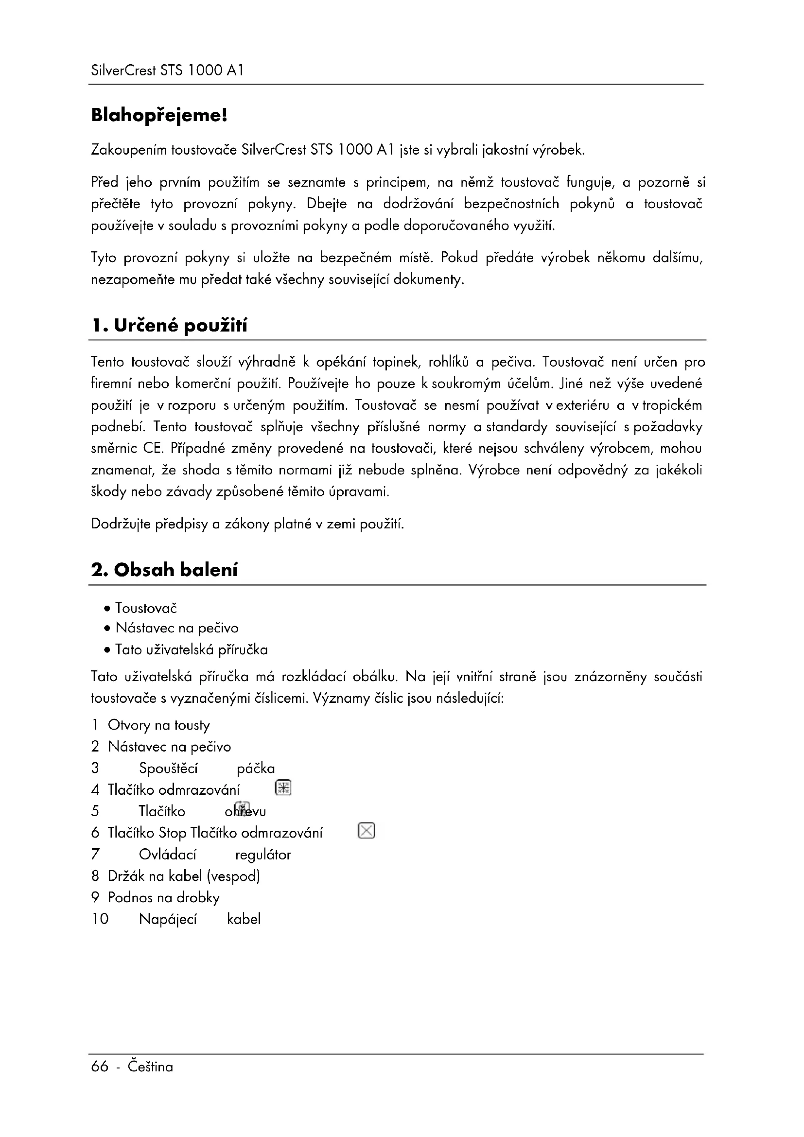 Tento toustovač slouží výhradně k opékání topinek, rohlíků a pečiva. Toustovač není určen pro firemní nebo komerční použití. Používejte ho pouze k soukromým účelům. Jiné než výše uvedené použití je v rozporu s určeným použitím. Toustovač se nesmí používat v exteriéru a v tropickém podnebí. Tento toustovač splňuje všechny příslušné normy a standardy související s požadavky směrnic CE. Případné změny provedené na toustovači, které nejsou schváleny výrobcem, mohou znamenat, že shoda s těmito normami již nebude splněna. Výrobce není odpovědný za jakékoli škody nebo závady způsobené těmito úpravami. Dodržujte předpisy a zákony platné v zemi použití.