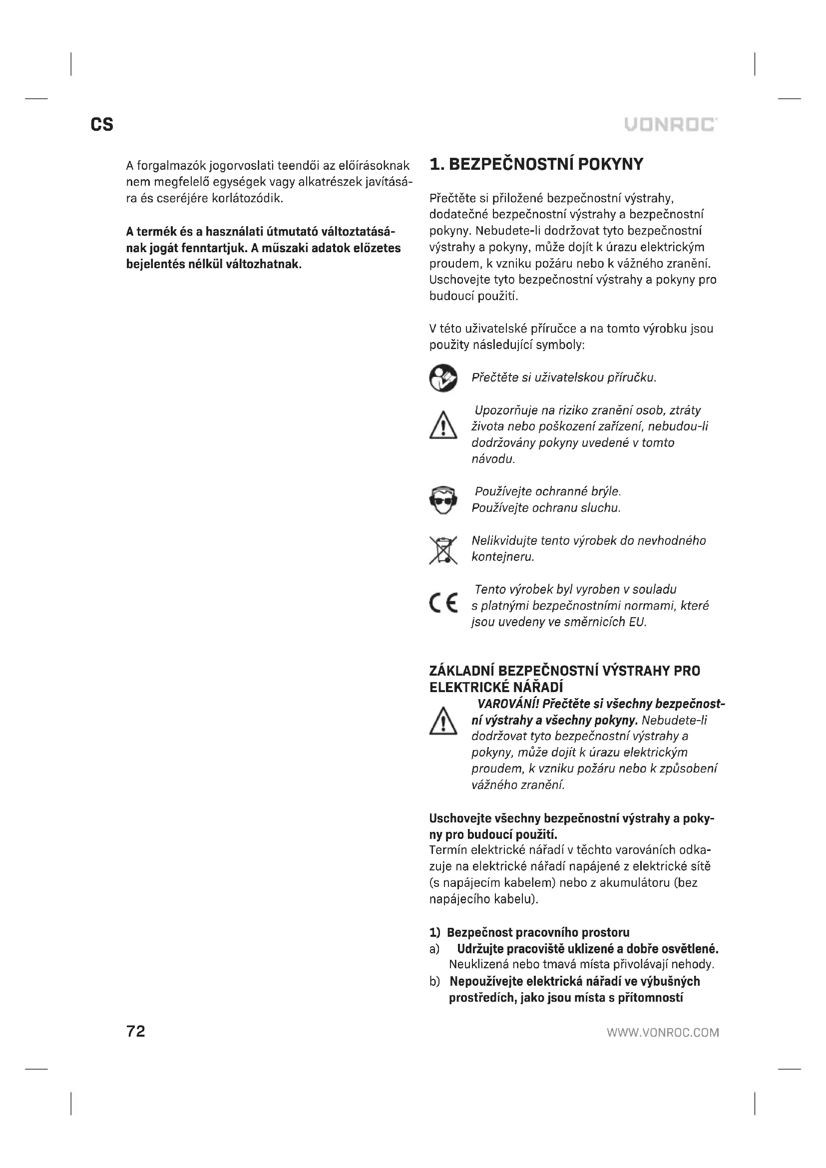 - Byly použity neoriginální náhradní díly. Výše uvedené představuje jedinou záruku poskyto- vanou společností, ať už výslovnou nebo předpo- kládanou. Neexistují žádné další záruky, výslovné ani nebo předpokládané, které přesahují rámec zde uvedeného, včetně předpokládaných záruk prodejnosti a vhodnosti pro určitý účel. VONROC v žádném případě neodpovídá za jakékoliv náhodné nebo následné škody. Opravné prostředky prodejců se omezují výhradně na opravu nebo výměnu nevy- hovujících jednotek nebo dílů. Na tomto výrobku a v tomto návodu mohou být prováděny změny. Technické údaje mohou být změ- něny bez předchozího upozornění.WWW.VONROC.COM