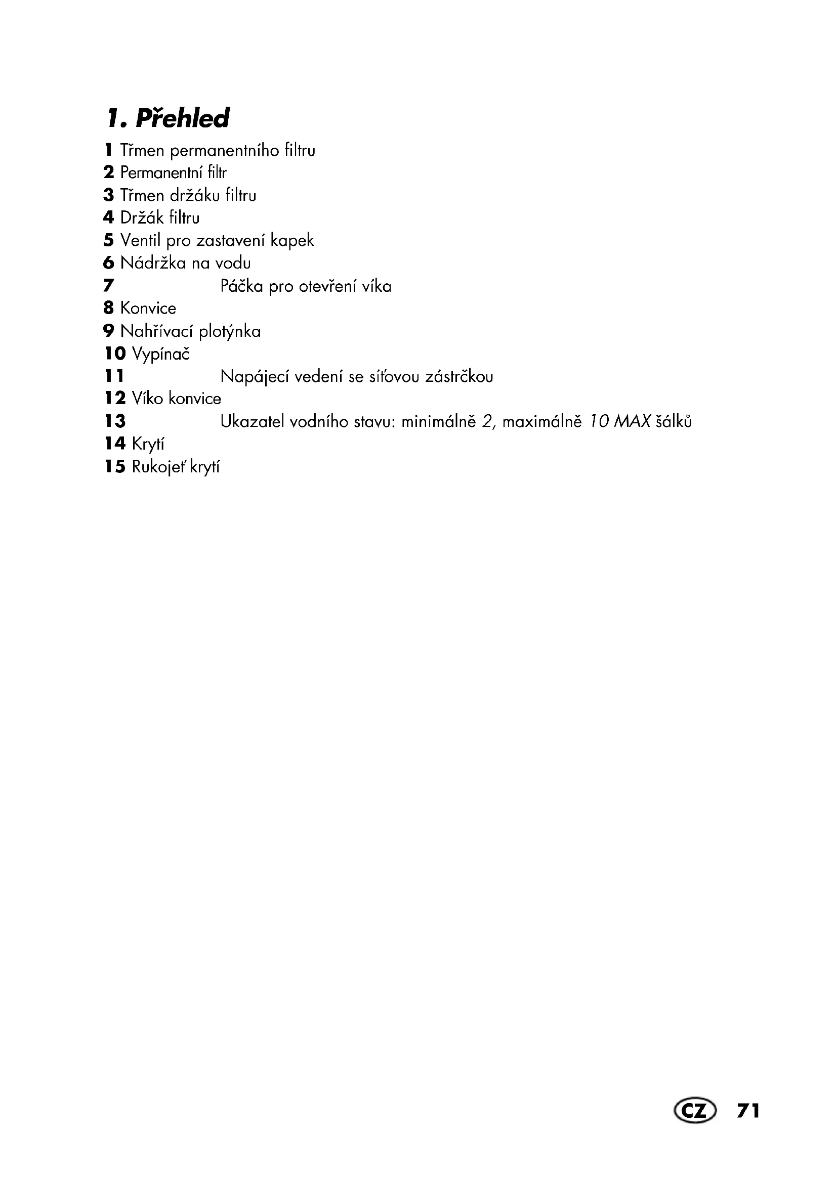 1 Třmen permanentního filtru 2 Permanentní filtr 3 Třmen držáku filtru 4 Držák filtru 5 Ventil pro zastavení kapek 6 Nádržka na vodu 7 Páčka pro otevření víka 8 Konvice 9 Nahřívací plotýnka 10 Vypínač 11 Napájecí vedení se síťovou zástrčkou 12 Víko konvice 13 Ukazatel vodního stavu: minimálně 2, maximálně 10 MAX šálků 14 Krytí 15 Rukojeť krytí __329281_Kaffeemaschine_B8.book Seite 71 Freitag, 13. September 2019 9:41 0972