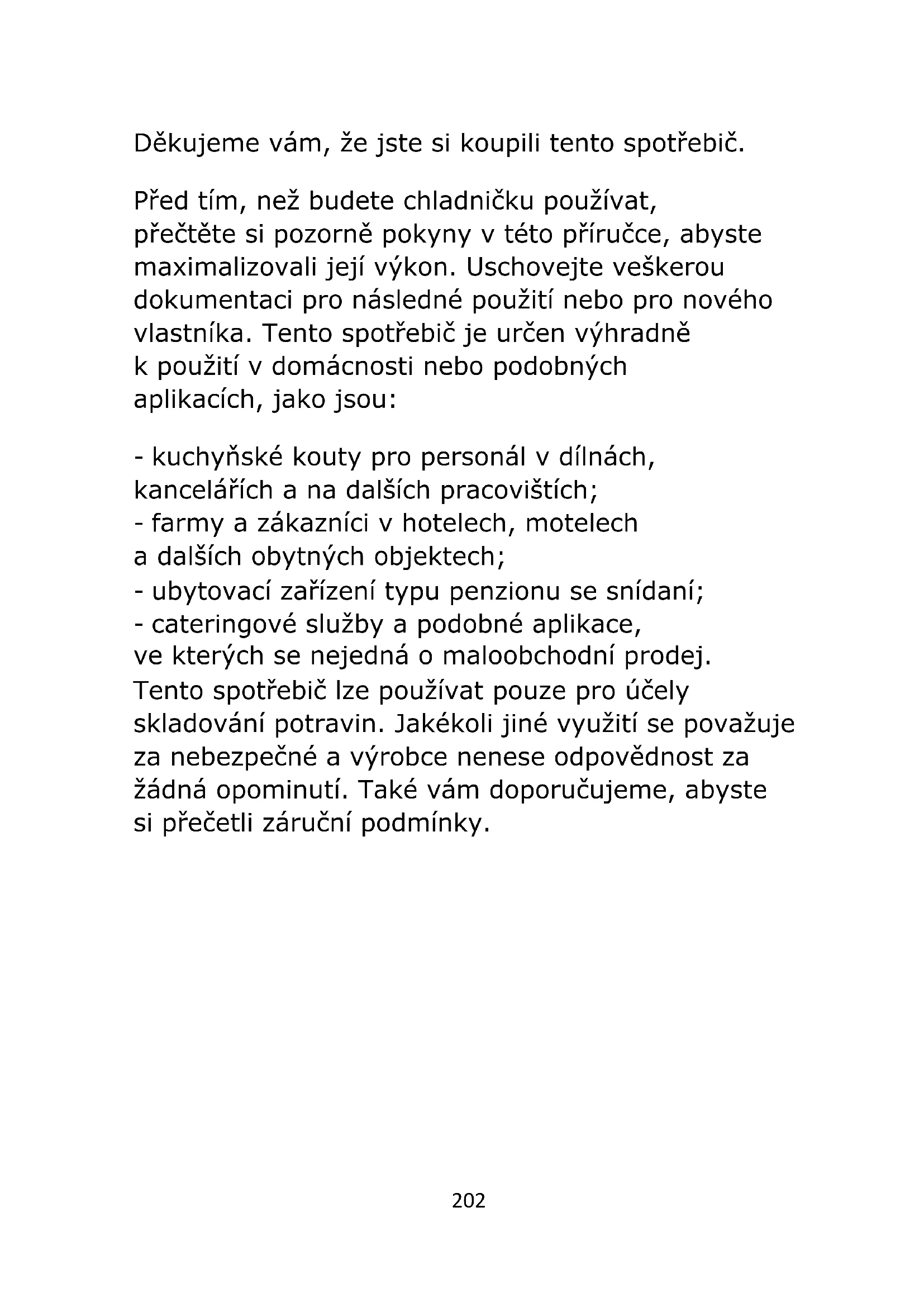 monte a dobradiça inferior na parte superior, certifique -se de que 1-2- 3 estão muito próximos202 Děkujeme vám, že jste si koupili tento spotřebič. Před tím, než budete chladničku používat, přečtěte si pozorně pokyny v této příručce, abyste maximalizovali její výkon. Uschovejte veškerou dokumentaci pro následné použití nebo pro nového vlastníka. Tento spotřebič je určen výhradně k použití v domácnosti nebo podobných aplikacích, jako jsou: - kuchyňské kouty pro personál v dílnách, kancelářích a na dalších pracovištích; - farmy a zákazníci v hotelech, motelech a dalších obytných objektech; - ubytovací zařízení typu penzionu se snídaní; - cateringové služby a podobné aplikace, ve kterých se nejedná o maloobchodní prodej. Tento spotřebič lze používat pouze pro účely skladování potravin. Jakékoli jiné využití se považuje za nebezpečné a výrobce nenese odpovědnost za žádná opominutí. Také vám doporučujeme, abyste si přečetli záruční podmínky.203