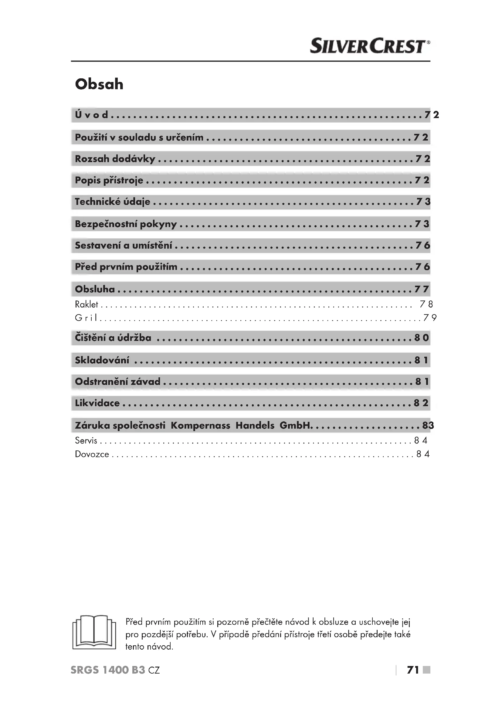 - Dovozce Před prvním použitím si pozorně přečtěte návod kobsluze a uschovejte jej pro pozdější potřebu. Vpřípadě předání přístroje třetí osobě předejte také tento návod.SRGS 1400 B3■ 72 p. 84