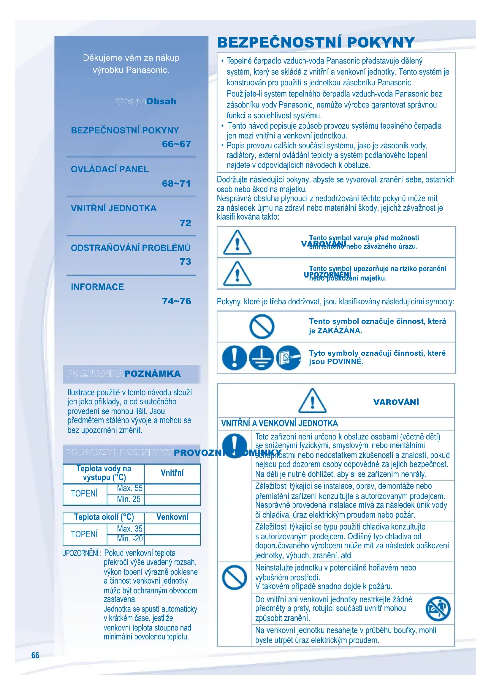 Teplota vody na výstupu (°C) Vnitřní TOPENÍ Max. 55 Min. 25 Teplota okolí (°C) Venkovní TOPENÍ Max. 35 Min. -20 UPOZORNĚNÍ : Pokud venkovní teplota překročí výše uvedený rozsah, výkon topení výrazně poklesne a činnost venkovní jednotky může být ochranným obvodem zastavena. Jednotka se spustí automaticky v krátkém čase, jestliže venkovní teplota stoupne nad minimální povolenou teplotu. Dodržujte následující pokyny, abyste se vyvarovali zranění sebe, ostatních osob nebo škod na majetku. Nesprávná obsluha plynoucí z nedodržování těchto pokynů může mít za následek újmu na zdraví nebo materiální škody, jejichž závažnost je klasifi kována takto: