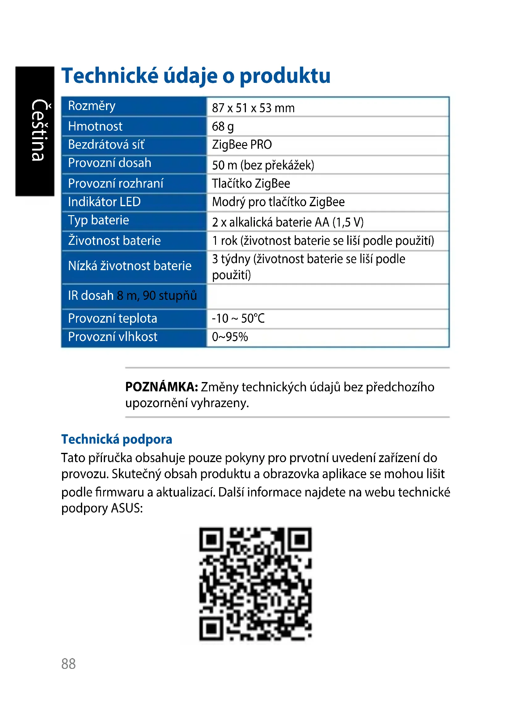 - Przy niskim poziomie naładowania baterii w aplikacji towarzyszącej pojawi się szara ikona i nie będzie można wykonywać konguracji. Stan będzie aktualizowany co 5 minut. 87Čeština Technické údaje o produktu Rozměry 87 x 51 x 53 mm Hmotnost 68 g Bezdrátová síť ZigBee PRO Provozní dosah 50 m (bez překážek) Provozní rozhraní Tlačítko ZigBee Indikátor LED Modrý pro tlačítko ZigBee Typ baterie 2 x alkalická baterie AA (1,5 V) Životnost baterie 1 rok (životnost baterie se liší podle použití) Nízká životnost baterie 3 týdny (životnost baterie se liší podle použití) IR dosah 8 m, 90 stupňů Provozní teplota -10 ~ 50°C Provozní vlhkost 0~95% POZNÁMKA: Změny technických údajů bez předchozího upozornění vyhrazeny. Technická podpora Tato příručka obsahuje pouze pokyny pro prvotní uvedení zařízení do provozu. Skutečný obsah produktu a obrazovka aplikace se mohou lišit podle rmwaru a aktualizací. Další informace najdete na webu technické podpory ASUS: 88Čeština Popis produktu IR snímač pohybu Detekuje pohyb prostřednictvím IR technologie. Rozsah detekce tohoto zařízení je ±90 stupňů s dosahem 8 m. Tlačítko ZigBee Stisknutím se připojíte k domácí bráně. Stisknutím a podržením po dobu 5 sekund resetujete zařízení. POZNÁMKA: Chcete-li odebrat zařízení ASUS Smart Home, nezapomeňte jej resetovat a zcela odstranit z doprovodné aplikace. 89Čeština Indikátor LED ZigBee Podrobnosti o stavovém indikátoru LED viz následující tabulka: Barva Stav Popis Svítí modře Zařízení se zapíná Svítí 1 sekundu Odpojování od domácí brány Stiskněte a podržte tlačítko ZigBee 5 sekund Identikování zařízení Svítí 5 sekund Bliká modře Připojování k domácí bráně Stisknutím tlačítka ZigBee se připojte k domácí bráně 90Čeština Požadavky na systém