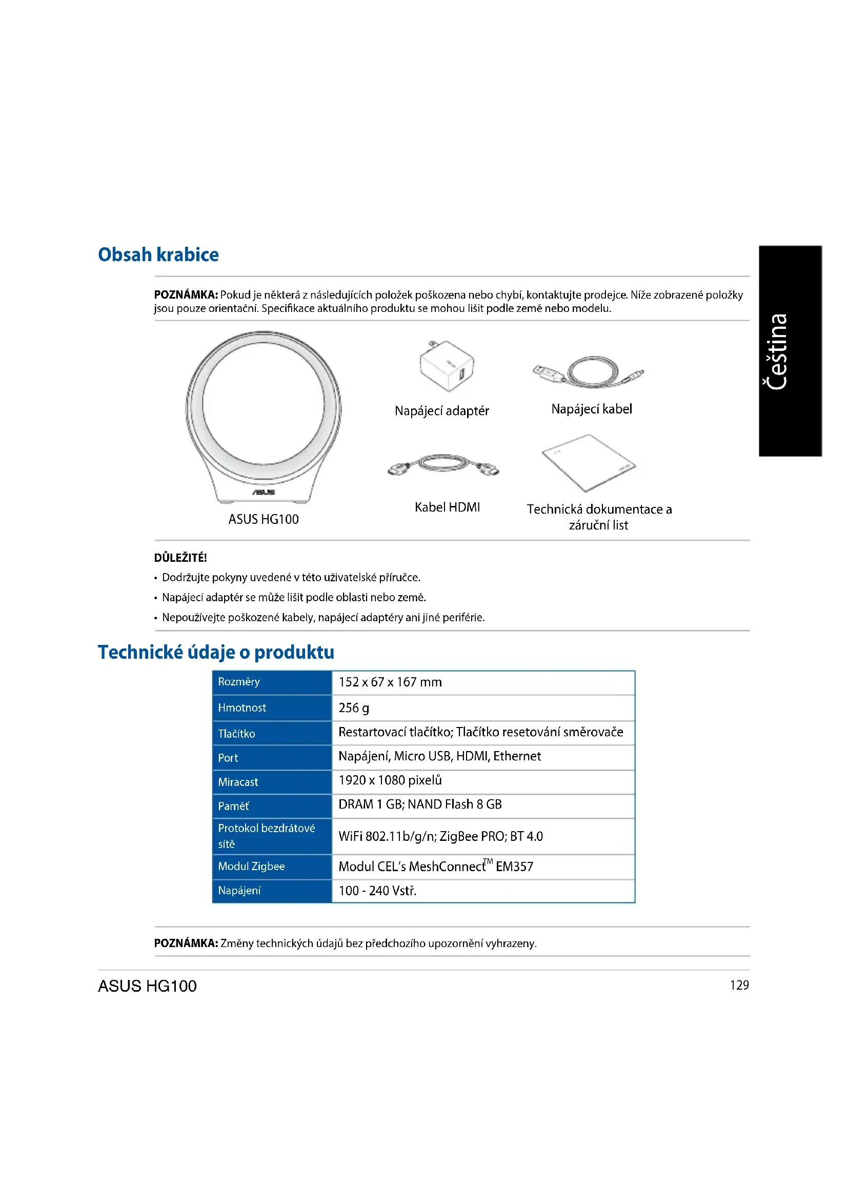 - Nepoužívejte poškozené kabely, napájecí adaptéry ani jiné periférie. Obsah krabice POZNÁMKA: Pokud je některá z následujících položek poškozena nebo chybí, kontaktujte prodejce. Níže zobrazené položky jsou pouze orientační. Specikace aktuálního produktu se mohou lišit podle země nebo modelu. Technické údaje o produktu Rozměry 152 x 67 x 167 mm Hmotnost 256 g Tlačítko Restartovací tlačítko; Tlačítko resetování směrovače Port Napájení, Micro USB, HDMI, Ethernet Miracast 1920 x 1080 pixelů Paměť DRAM 1 GB; NAND Flash 8 GB Protokol bezdrátové sítě WiFi 802.11b/g/n; ZigBee PRO; BT 4.0 Modul Zigbee Modul CEL’s MeshConnect