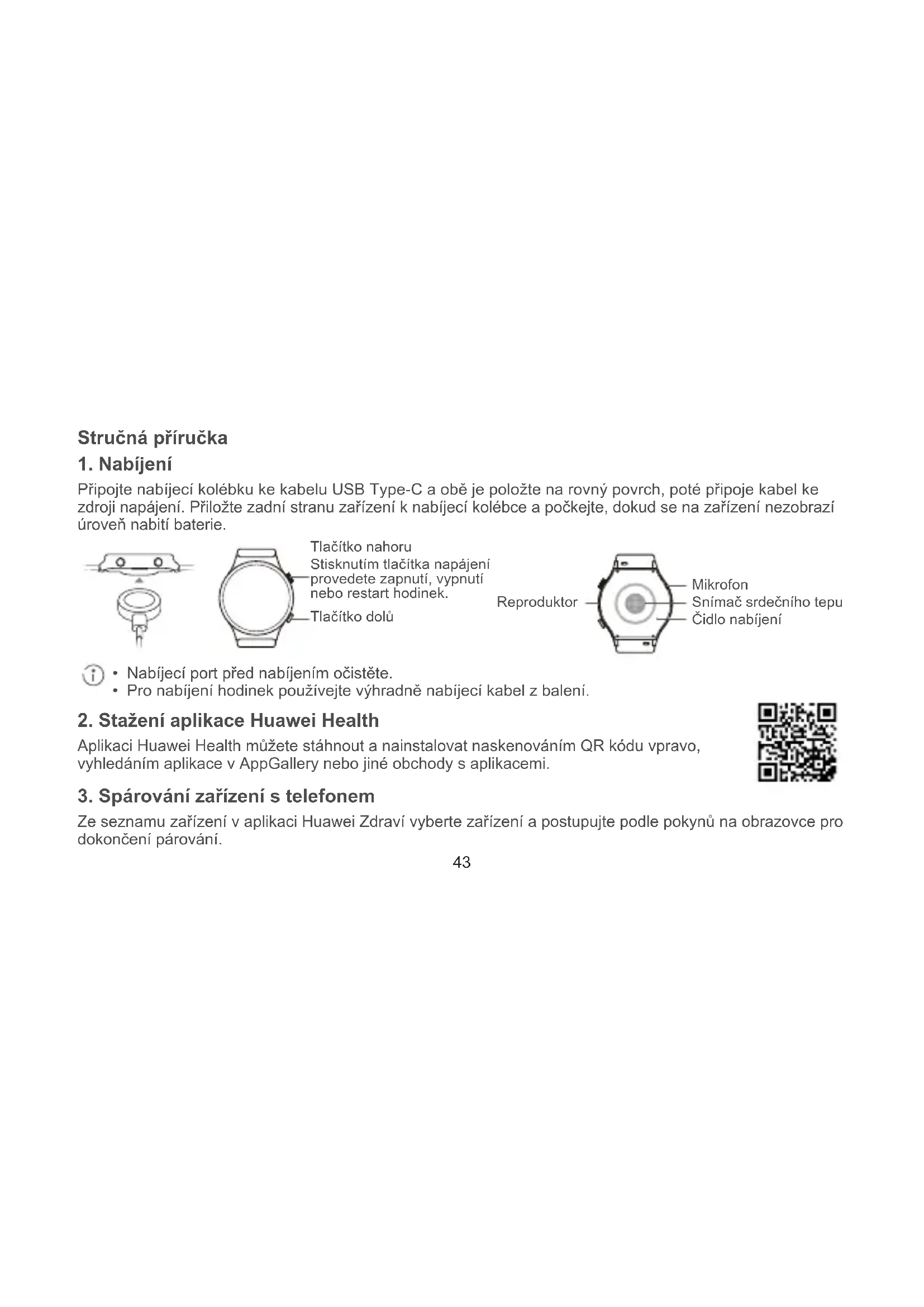 - Pro nabíjení hodinek používejte výhradně nabíjecí kabel z balení. 2.StaženíaplikaceHuaweiHealth Aplikaci Huawei Health můžete stáhnout a nainstalovat naskenováním QR kódu vpravo, vyhledáním aplikace v AppGallery nebo jiné obchody s aplikacemi. 3.Spárovánízařízenístelefonem Ze seznamu zařízení v aplikaci Huawei Zdraví vyberte zařízení a postupujte podle pokynů na obrazovce pro dokončení párování. Tlačítko nahoru Stisknutím tlačítka napájení provedete zapnutí, vypnutí nebo restart hodinek. Reproduktor Tlačítko dolů Snímač srdečního tepu Čidlo nabíjení Mikrofon44 Copyright © Huawei 2020. Všechna práva vyhrazena. TENTO DOKUMENT MÁ POUZE INFORMAČNÍ ÚČEL A NEPOSKYTUJE ŽÁDNÉ ZÁRUKY. Ochranné známky a povolení Slovní značka a loga Bluetooth