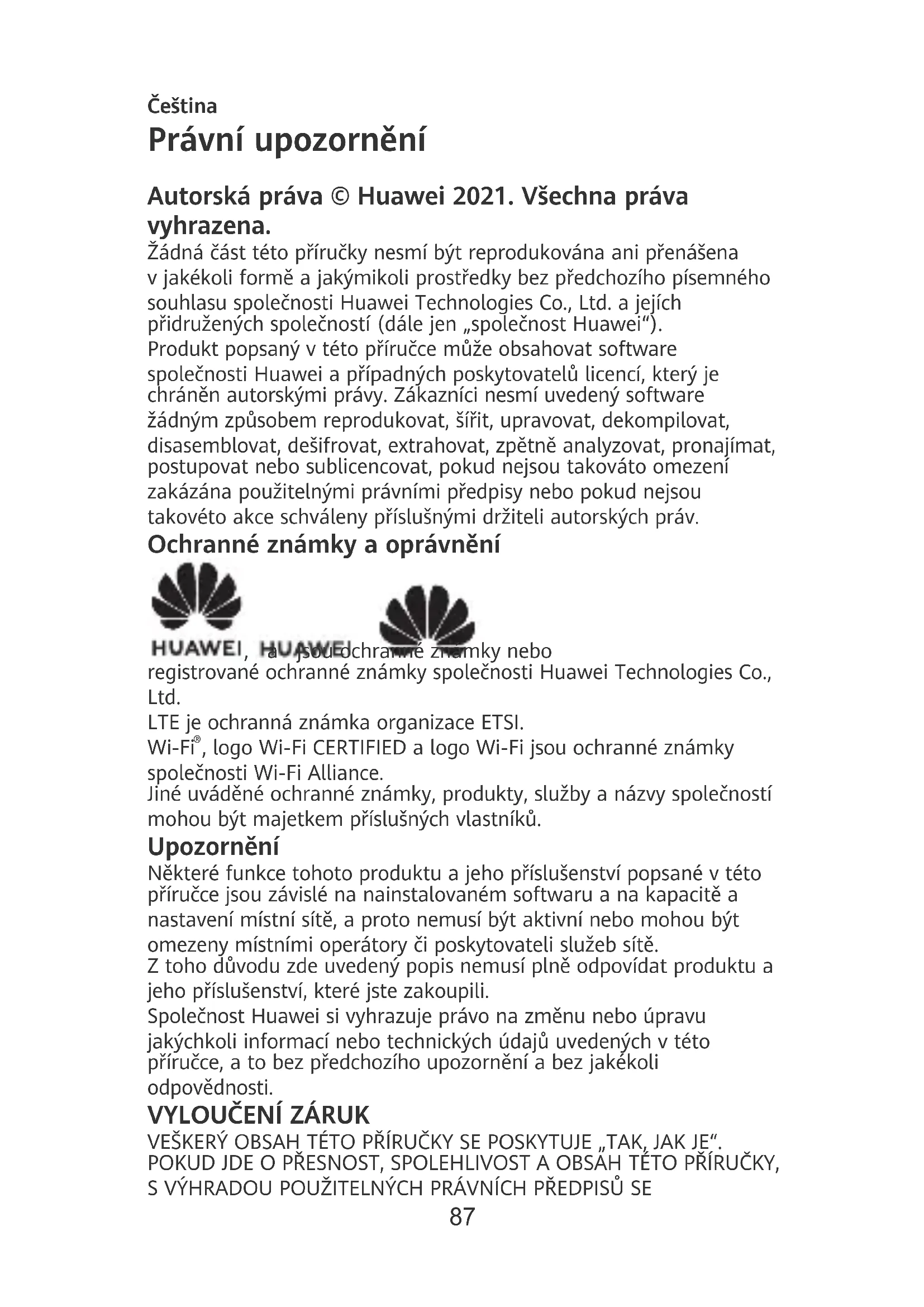 , logo Wi-Fi CERTIFIED a logo Wi-Fi jsou ochranné známky společnosti Wi-Fi Alliance. Jiné uváděné ochranné známky, produkty, služby a názvy společností mohou být majetkem příslušných vlastníků. Upozornění Některé funkce tohoto produktu a jeho příslušenství popsané v této příručce jsou závislé na nainstalovaném softwaru a na kapacitě a nastavení místní sítě, a proto nemusí být aktivní nebo mohou být omezeny místními operátory či poskytovateli služeb sítě. Z toho důvodu zde uvedený popis nemusí plně odpovídat produktu a jeho příslušenství, které jste zakoupili. Společnost Huawei si vyhrazuje právo na změnu nebo úpravu jakýchkoli informací nebo technických údajů uvedených v této příručce, a to bez předchozího upozornění a bez jakékoli odpovědnosti.