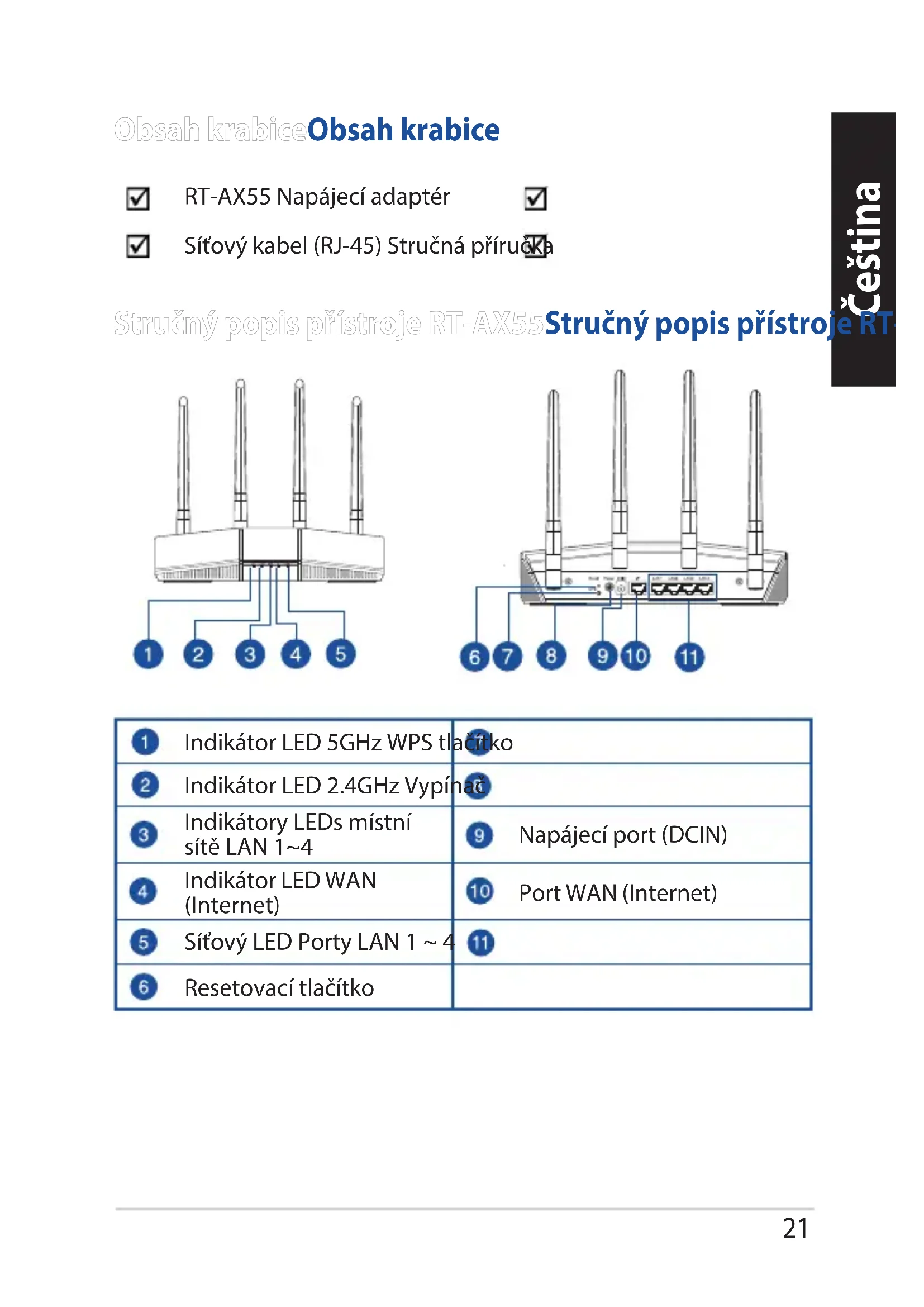 - Korisnički priručnik možete naći na internetu na https://www.asus.com/support21 Čeština Stručný popis přístroje RT-AX55Stručný popis přístroje RT-AX55 Obsah krabiceObsah krabice RT-AX55 Napájecí adaptér Síťový kabel (RJ-45) Stručná příručka Indikátor LED 5GHz WPS tlačítko Indikátor LED 2.4GHz Vypínač Indikátory LEDs místní sítě LAN 1~4 Napájecí port (DCIN) Indikátor LED WAN (Internet) Port WAN (Internet) Síťový LED Porty LAN 1 ~ 4 Resetovací tlačítko Čeština22 Čeština Umístění směrovačeUmístění směrovače Aby byl zajištěn optimální přenos bezdrátového signálu mezi bezdrátovým směrovačem a síťovými zařízeními, zajistěte, aby byly splněny následující podmínky:
