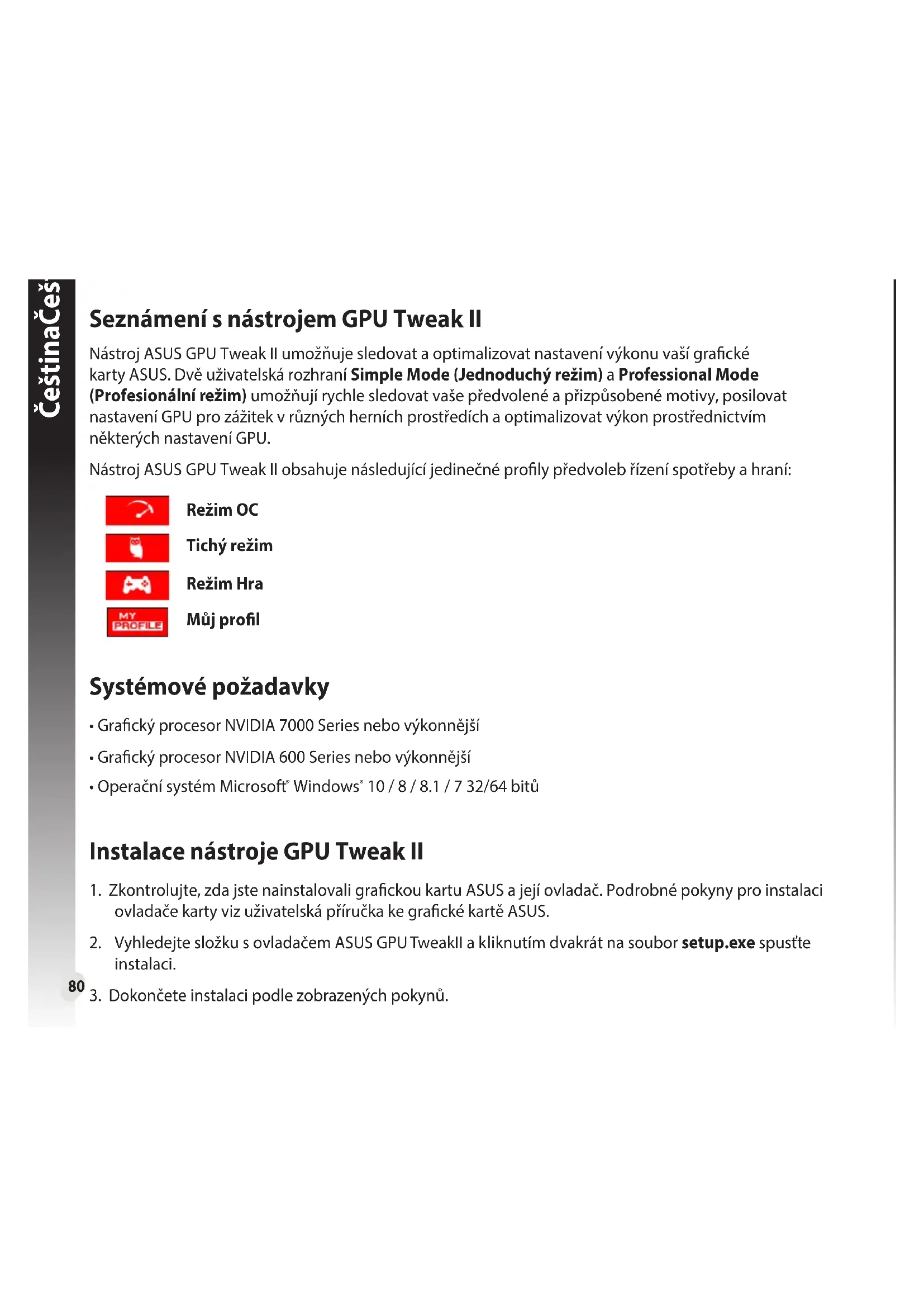 Горячие клавиши Используйте горячие клавиши для быстрого отображения главного экрана или применения быстрых настроек. Настройки горячих клавиш80 ČeštinaČeština Seznámení s nástrojem GPU Tweak II Nástroj ASUS GPU Tweak II umožňuje sledovat a optimalizovat nastavení výkonu vaší gracké karty ASUS. Dvě uživatelská rozhraní Simple Mode (Jednoduchý režim) a Professional Mode (Profesionální režim) umožňují rychle sledovat vaše předvolené a přizpůsobené motivy, posilovat nastavení GPU pro zážitek v různých herních prostředích a optimalizovat výkon prostřednictvím některých nastavení GPU. Nástroj ASUS GPU Tweak II obsahuje následující jedinečné proly předvoleb řízení spotřeby a hraní: Režim OC Tichý režim Režim Hra Můj prol Systémové požadavky